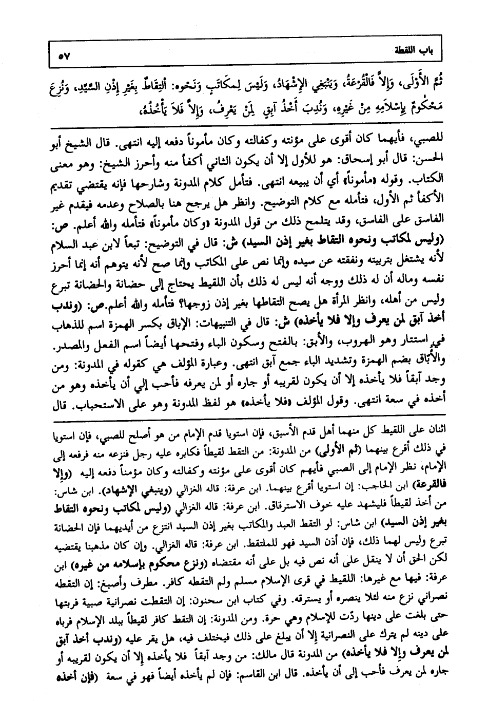ص: (وَنُدِبَ أَخْذُ آبِقٍ لِمَنْ يَعْرِفُ وَإِلَّا فَلَا يَأْخُذُهُ) ش: قَالَ فِي التَّنْبِيهَاتِ: الْإِبَاقُ بِكَسْرِ الْهَمْزَةِ اسْمٌ لِلذَّهَابِ فِي اسْتِتَارٍ وَهُوَ الْهُرُوبُ وَالْأَبْقُ بِالْفَتْحِ وَسُكُونِ الْبَاءِ وَفَتْحِهَا أَيْضًا اسْمُ الْفِعْلِ وَالْمَصْدَرِ وَالْأُبَّاقُ بِضَمِّ الْهَمْزَةِ وَتَشْدِيدِ الْبَاءِ جَمْعُ آبِقٍ، انْتَهَى. وَعِبَارَةُ الْمُؤَلِّفِ هِيَ كَقَوْلِهِ فِي الْمُدَوَّنَةِ: وَمَنْ وَجَدَ آبِقًا فَلَا يَأْخُذُهُ إلَّا أَنْ يَكُونَ لِقَرِيبِهِ أَوْ جَارِهِ أَوْ لِمَنْ يَعْرِفُهُ فَأَحَبُّ إلَيَّ أَنْ يَأْخُذَهُ وَهُوَ مِنْ أَخْذِهِ فِي سَعَةٍ، انْتَهَى. وَقَوْلُ الْمُؤَلِّفِ: "فَلَا يَأْخُذُهُ" هُوَ لَفْظُ الْمُدَوَّنَةِ وَهُوَ عَلَى الِاسْتِحْبَابِ. قَال