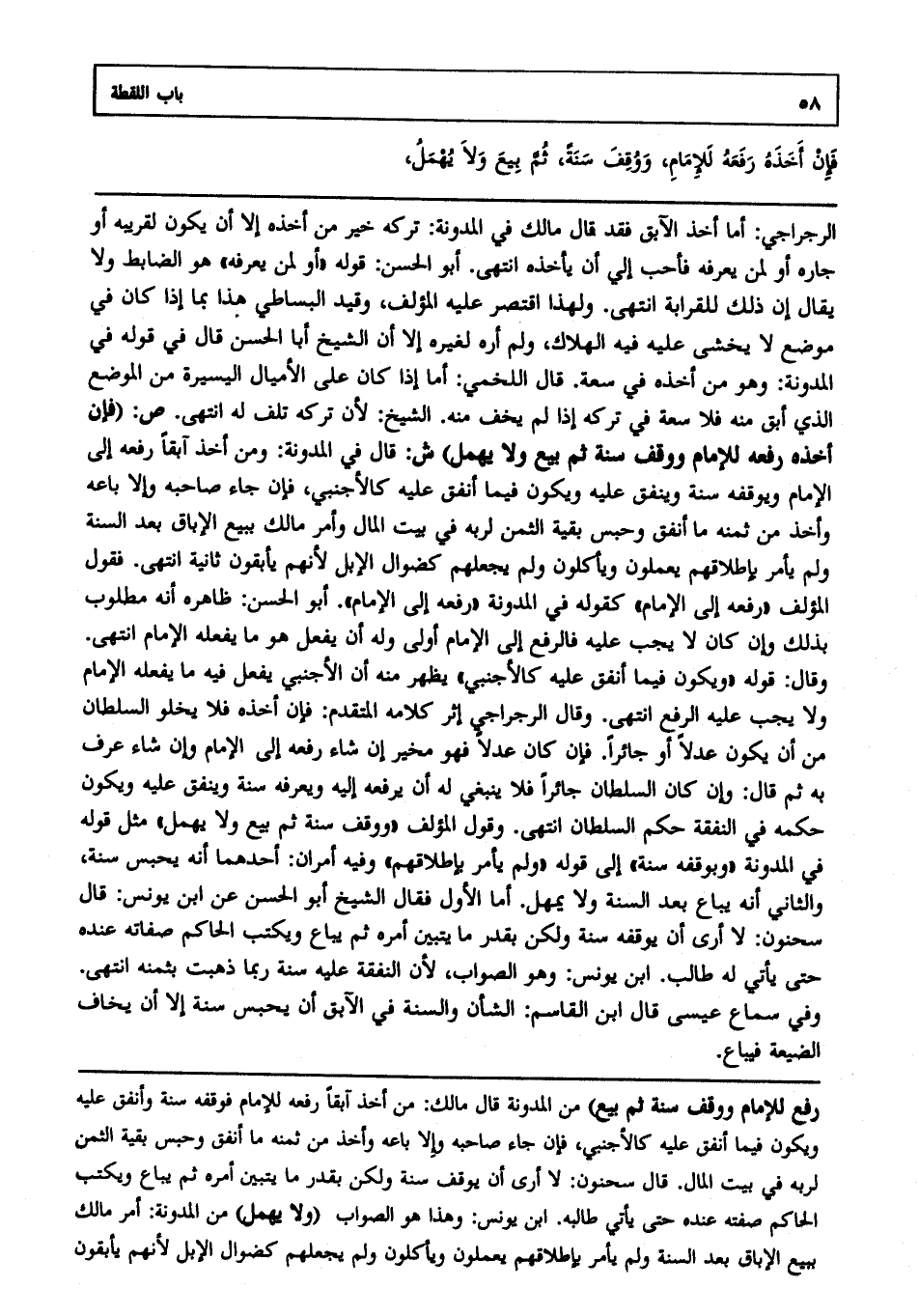 الرَّجْرَاجِيُّ: أَمَّا أَخْذُ الْآبِقِ فَقَدْ، قَالَ مَالِكٌ فِي الْمُدَوَّنَةِ: تَرْكُهُ خَيْرٌ مِنْ أَخْذِهِ إلَّا أَنْ يَكُونَ لِقَرِيبِهِ أَوْ جَارِهِ أَوْ لِمَنْ يَعْرِفُهُ فَأَحَبُّ إلَيَّ أَنْ يَأْخُذَهُ، انْتَهَى. أَبُو الْحَسَنِ قَوْلُهُ أَوْ لِمَنْ يَعْرِفُهُ هُوَ الضَّابِطُ وَلَا يُقَالُ أَنَّ ذَلِكَ لِلْقَرَابَةِ، انْتَهَى. وَلِهَذَا اقْتَصَرَ عَلَيْهِ الْمُؤَلِّفُ وَقَيَّدَ الْبِسَاطِيُّ هَذَا بِمَا إذَا كَانَ فِي مَوْضِعٍ لَا يُخْشَى عَلَيْهِ فِيهِ الْهَلَاكُ وَلَمْ أَرَهُ لِغَيْرِهِ إلَّا أَنَّ الشَّيْخَ أَبَا الْحَسَنِ، قَالَ فِي قَوْلِهِ فِي الْمُدَوَّنَةِ: وَهُوَ مِنْ أَخْذِهِ فِي سَعَةٍ، قَالَ اللَّخْمِيُّ: أَمَّا إذَا كَانَ عَلَى الْأَمْيَالِ الْيَسِيرَةِ مِنْ الْمَوْضِعِ الَّذِي أَبَقَ مِنْهُ فَلَا سَعَةَ فِي تَرْكِهِ إذَا لَمْ يَخَفْ مِنْهُ الشَّيْخُ؛ لِأَنَّ تَرْكَهُ تَلَفٌ لَهُ، انْتَهَى. ص: (فَإِنْ أَخَذَهُ رَفَعَهُ لِلْإِمَامِ وَوُقِفَ سَنَةً ثُمَّ بِيعَ وَلَا يُهْمَلُ) ش: قَالَ فِي الْمُدَوَّنَةِ: وَمَنْ أَخَذَ آبِقًا رَفَعَهُ إلَى الْإِمَامِ وَيُوقِفُهُ سَنَةً وَيُنْفِقُ عَلَيْهِ وَيَكُونُ فِيمَا أَنْفَقَ عَلَيْهِ كَالْأَجْنَبِيِّ فَإِنْ جَاءَ صَاحِبُهُ وَإِلَّا بَاعَهُ وَأَخَذَ مِنْ ثَمَنِهِ مَا أَنْفَقَ وَحَبَسَ بَقِيَّةَ الثَّمَنِ لِرَبِّهِ فِي بَيْتِ الْمَالِ وَأَمَرَ مَالِكٌ بِبَيْعِ الْإِبَاقِ بَعْدَ السَّنَةِ وَلَمْ يَأْمُرْ بِإِطْلَاقِهِمْ يَعْمَلُونَ وَيَأْكُلُونَ وَلَمْ يَجْعَلْهُمْ كَضَوَالِّ الْإِبِلِ؛ لِأَنَّهُمْ يَأْبِقُونَ ثَانِيَةً، انْتَهَى. فَقَوْلُ الْمُؤَلِّفِ: "رَفَعَهُ إلَى الْإِمَامِ" كَقَوْلِهِ فِي الْمُدَوَّنَةِ: "رَفَعَهُ إلَى الْإِمَامِ". أَبُو الْحَسَنِ: ظَاهِرُهُ أَنَّهُ مَطْلُوبٌ بِذَلِكَ وَإِنْ كَانَ لَا يَجِبُ عَلَيْهِ فَالرَّفْعُ إلَى الْإِمَامِ أَوْلَى وَلَهُ أَنْ يَفْعَلَ هُوَ مَا يَفْعَلُهُ الْإِمَامُ، انْتَهَى. وَقَالَ: قَوْلُهُ: "وَيَكُونُ فِيمَا أَنْفَقَ عَلَيْهِ كَالْأَجْنَبِيِّ" يَظْهَرُ مِنْهُ أَنَّ الْأَجْنَبِيَّ يَفْعَلُ فِيهِ مَا يَفْعَلُهُ الْإِمَامُ وَلَا يَجِبُ عَلَيْهِ الرَّفْعُ، انْتَهَى. وَقَالَ الرَّجْرَاجِيُّ إثْرَ كَلَامِهِ الْمُتَقَدِّمِ: فَإِنْ أَخْذَهُ فَلَا يَخْلُو السُّلْطَانُ مِنْ أَنْ يَكُونَ عَدْلًا أَوْ جَائِرًا فَإِنْ كَانَ عَدْلًا فَهُوَ مُخَيَّرٌ إنْ شَاءَ رَفَعَهُ إلَى الْإِمَامِ وَإِنْ شَاءَ عَرَّفَ بِهِ ثُمَّ قَالَ: وَإِنْ كَانَ السُّلْطَانُ جَائِرًا فَلَا يَنْبَغِي لَهُ أَنْ يَرْفَعَهُ إلَيْهِ وَيُعَرِّفَهُ سَنَةً وَيُنْفِقَ عَلَيْهِ وَيَكُونَ حُكْمُهُ فِي النَّفَقَةِ حُكْمَ السُّلْطَانِ، انْتَهَى. وَقَوْلُ الْمُؤَلِّفِ: "وَوُقِفَ سَنَةً ثُمَّ بِيعَ وَلَا يُهْمَلُ" مِثْلُ قَوْلِهِ فِي الْمُدَوَّنَةِ: "وَيُوقِفُهُ سَنَةً" إلَى قَوْلِهِ: "وَلَمْ يَأْمُرْ بِإِطْلَاقِهِمْ" وَفِيهِ أَمْرَانِ، أَحَدُهُمَا: أَنَّهُ يُحْبَسُ سَنَةً، وَالثَّانِي: أَنَّهُ يُبَاعُ بَعْدَ السَّنَةِ وَلَا يُمْهَلُ، أَمَّا الْأَوَّلُ، فَقَالَ الشَّيْخُ أَبُو الْحَسَنِ: عَنْ ابْنِ يُونُسَ، قَالَ سَحْنُونٌ: لَا أَرَى أَنْ يُوقِفَهُ سَنَةً وَلَكِنْ بِقَدْرِ مَا يَتَبَيَّنُ أَمْرَهُ ثُمَّ يُبَاعُ وَيَكْتُبُ الْحَاكِمُ صِفَاتِهِ عِنْدَهُ حَتَّى يَأْتِيَ لَهُ طَالِبٌ. ابْنُ يُونُسَ: وَهُوَ الصَّوَابُ؛ لِأَنَّ النَّفَقَةَ عَلَيْهِ سَنَةً رُبَمَا ذَهَبَتْ بِثَمَنِهِ، انْتَهَى. وَفِي سَمَاعِ عِيسَى، قَالَ ابْنُ الْقَاسِمِ: الشَّأْنُ وَالسَّنَةُ فِي الْآبِقِ أَنْ يُحْبَسَ سَنَةً إلَّا أَنْ يَخَافَ الضَّيْعَةَ فَيُبَاعُ.