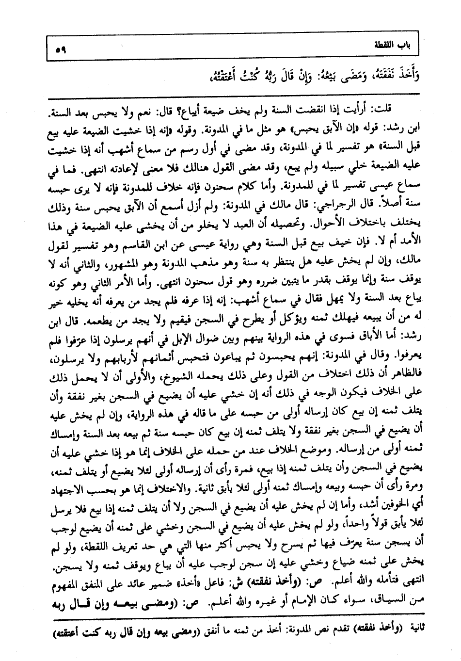 قلت: أَرَأَيْت إذَا انْقَضَتْ السَّنَةُ وَلَمْ يَخَفْ ضَيْعَةً أَيُبَاعُ، قَالَ: نَعَمْ وَلَا يُحْبَسُ بَعْدَ السَّنَةِ ابْنُ رُشْدٍ: قَوْلُهُ: "إنَّ الْآبِقَ يُحْبَسُ" هُوَ مِثْلُ مَا فِي الْمُدَوَّنَةِ وَقَوْلُهُ: "إنَّهُ إذَا خُشِيَتْ الضَّيْعَةُ عَلَيْهِ بِيعَ قَبْلَ السَّنَةِ" هُوَ تَفْسِيرٌ لِمَا فِي الْمُدَوَّنَةِ وَقَدْ مَضَى فِي أَوَّلِ رَسْمٍ مِنْ سَمَاعِ أَشْهَبَ أَنَّهُ إذَا خُشِيَتْ عَلَيْهِ الضَّيْعَةُ خُلِّيَ سَبِيلَهُ وَلَمْ يُبَعْ وَقَدْ مَضَى الْقَوْلُ هُنَالِكَ فَلَا مَعْنَى لِإِعَادَتِهِ، انْتَهَى. فَمَا فِي سَمَاعِ عِيسَى تَفْسِيرٌ لِمَا فِي الْمُدَوَّنَةِ وَأَمَّا كَلَامُ سَحْنُونٍ فَإِنَّهُ خِلَافٌ لِلْمُدَوَّنَةِ فَإِنَّهُ لَا يَرَى حَبْسَهُ سَنَةً أَصْلًا، قَالَ الرَّجْرَاجِيُّ: قَالَ مَالِكٌ فِي الْمُدَوَّنَةِ: وَلَمْ أَزَلْ أَسْمَعُ أَنَّ الْآبِقَ يُحْبَسُ سَنَةً وَذَلِكَ يَخْتَلِفُ بِاخْتِلَافِ الْأَحْوَالِ وَتَحْصِيلُهُ أَنَّ الْعَبْدَ لَا يَخْلُو مِنْ أَنْ يُخْشَى عَلَيْهِ الضَّيْعَةُ فِي هَذَا الْأَمَدِ أَمْ لَا فَإِنْ خِيفَ بِيعَ قَبْلَ السَّنَةِ وَهِيَ رِوَايَةُ عِيسَى عَنْ ابْنِ الْقَاسِمِ وَهُوَ تَفْسِيرٌ لِقَوْلِ مَالِكٍ وَإِنْ لَمْ يُخْشَ عَلَيْهِ هَلْ يُنْتَظَرُ بِهِ سَنَةً وَهُوَ مَذْهَبُ الْمُدَوَّنَةِ وَهُوَ الْمَشْهُورُ، وَالثَّانِي أَنَّهُ لَا يُوقَفُ سَنَةً وَإِنَّمَا يُوقَفُ بِقَدْرِ مَا يَتَبَيَّنُ ضَرَرَهُ وَهُوَ قَوْلُ سَحْنُونٍ، انْتَهَى. وَأَمَّا الْأَمْرُ الثَّانِي وَهُوَ كَوْنُهُ يُبَاعُ بَعْدَ السَّنَةِ وَلَا يُمْهَلُ، فَقَالَ فِي سَمَاعِ أَشْهَبُ: إنَّهُ إذَا عَرَّفَهُ فَلَمْ يَجِدْ مَنْ يَعْرِفُهُ أَنَّهُ يُخَلِّيهِ خَيْرٌ لَهُ مِنْ أَنْ يَبِيعَهُ فَيَهْلَكَ ثَمَنُهُ وَيُؤْكَلَ أَوْ يُطْرَحَ فِي السِّجْنِ فَيُقِيمُ وَلَا يَجِدُ مَنْ يُطْعِمُهُ، قَالَ ابْنُ رُشْدٍ: أَمَّا الْإِبَاقُ فَسَوَّى فِي هَذِهِ الرِّوَايَةِ بَيْنَهُمْ وَبَيْنَ ضَوَالِّ الْإِبِلِ فِي أَنَّهُمْ يُرْسَلُونَ إذَا عُرِّفُوا فَلَمْ يُعْرَفُوا، وَقَالَ فِي الْمُدَوَّنَةِ: إنَّهُمْ يُحْبَسُونَ ثُمَّ يُبَاعُونَ فَتُحْبَسُ أَثْمَانُهُمْ لِأَرْبَابِهِمْ وَلَا يُرْسَلُونَ فَالظَّاهِرُ أَنَّ ذَلِكَ اخْتِلَافٌ مِنْ الْقَوْلِ وَعَلَى ذَلِكَ يَحْمِلُهُ الشُّيُوخُ وَالْأَوْلَى أَنْ لَا يُحْمَلَ ذَلِكَ عَلَى الْخِلَافِ فَيَكُونُ الْوَجْهُ فِي ذَلِكَ أَنَّهُ إنْ خَشِيَ عَلَيْهِ أَنْ يَضِيعَ فِي السِّجْنِ بِغَيْرِ نَفَقَةٍ وَأَنْ يَتْلَفَ ثَمَنُهُ إنْ بِيعَ كَانَ إرْسَالُهُ أَوْلَى مِنْ حَبْسِهِ عَلَى مَا قَالَهُ فِي هَذِهِ الرِّوَايَةِ وَإِنْ لَمْ يَخْشَ عَلَيْهِ أَنْ يَضِيعَ فِي السِّجْنِ بِغَيْرِ نَفَقَةٍ وَلَا يَتْلَفُ ثَمَنُهُ إنْ بِيعَ كَانَ حَبْسُهُ سَنَةً ثُمَّ بَيْعُهُ بَعْدَ السَّنَةِ وَإِمْسَاكُ ثَمَنِهِ أَوْلَى مِنْ إرْسَالِهِ. وَمَوْضِعُ الْخِلَافِ عِنْدَ مَنْ حَمَلَهُ عَلَى الْخِلَافِ إنَّمَا هُوَ إذَا خَشِيَ عَلَيْهِ أَنْ يَضِيعَ فِي السِّجْنِ وَأَنْ يَتْلَفَ ثَمَنُهُ إذَا بِيعَ فَمَرَّةً رَأَى أَنْ إرْسَالَهُ أَوْلَى لِئَلَّا يَضِيعَ أَوْ يَتْلَفَ ثَمَنُهُ، وَمَرَّةً رَأَى أَنَّ حَبْسَهُ وَبَيْعَهُ وَإِمْسَاكَ ثَمَنِهِ أَوْلَى لِئَلَّا يَأْبِقَ ثَانِيَةً، وَالِاخْتِلَافُ إنَّمَا هُوَ بِحَسَبِ الِاجْتِهَادِ، أَيُّ الْخَوْفَيْنِ أَشَدُّ ؟ وَأَمَّا إنْ لَمْ يُخْشَ عَلَيْهِ أَنْ يَضِيعَ فِي السِّجْنِ وَلَا أَنْ يَتْلَفَ ثَمَنُهُ إذَا بِيعَ فَلَا يُرْسَلُ؛ لِئَلَّا يَأْبِقَ قَوْلًا وَاحِدًا وَلَوْ لَمْ يُخْشَ عَلَيْهِ أَنْ يَضِيعَ فِي السِّجْنِ وَخُشِيَ عَلَى ثَمَنِهِ أَنْ يَضِيعَ لَوَجَبَ أَنْ يُسْجَنَ سَنَةً يُعَرَّفُ فِيهَا ثُم