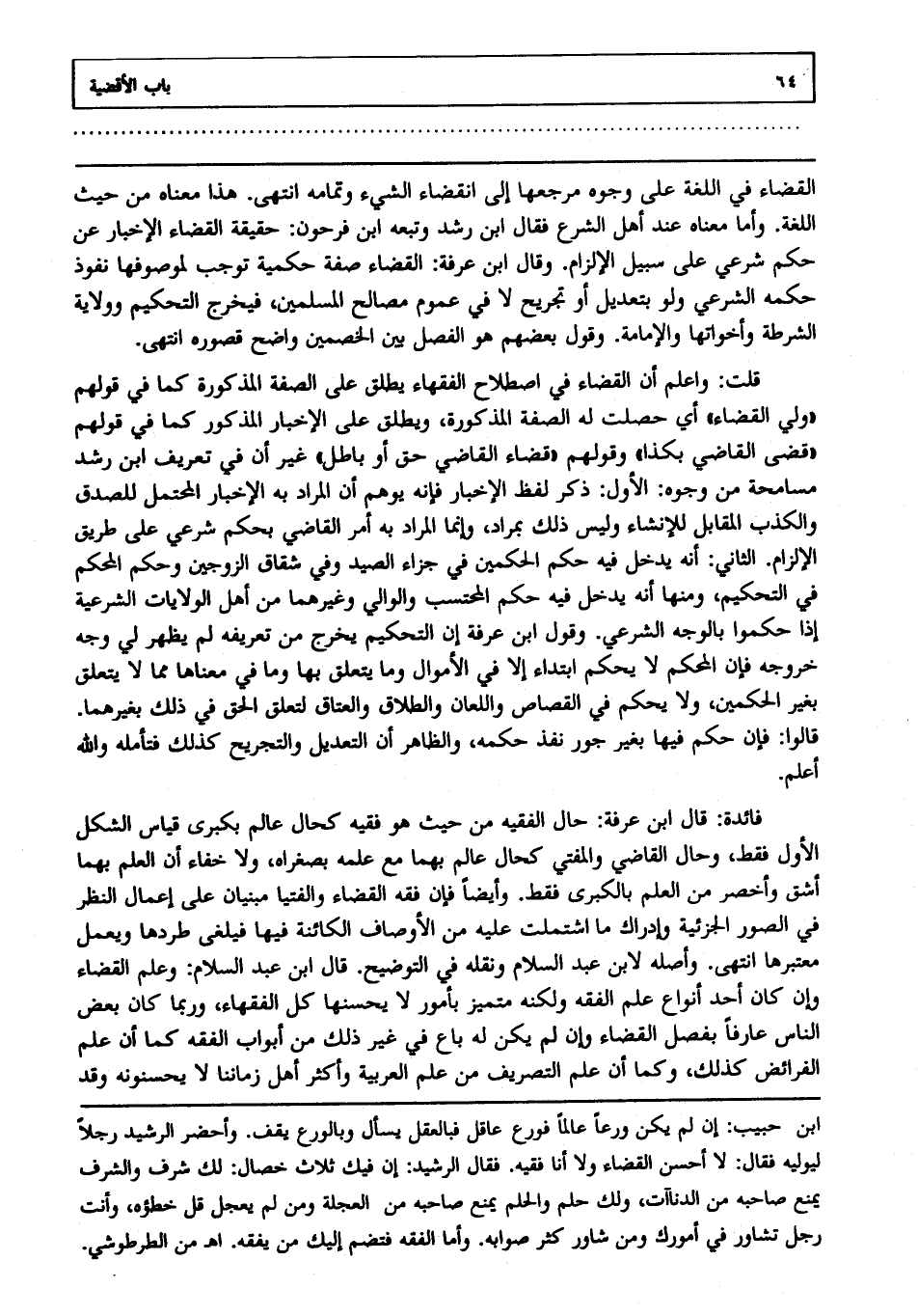 القضاء في اللغة على وجوه مرجعها إلى انقضاء الشيء وتمامه، انتهى. هذا معناه من حيث اللغة. وأما معناه عند أهل الشرع فقال ابن رشد وتبعه ابن فرحون: حقيقة القضاء: "الإخبار عن حكم شرعي على سبيل الإلزام". وقال ابن عرفة: "القضاء صفة حكمية، توجب لموصوفها نفوذ حكمه الشرعي ولو بتعديل أو تجريح لا في عموم مصالح المسلمين" فيخرج التحكيم وولاية الشرطة وأخواتها والإمامة. وقول بعضهم: "هو الفصل بين الخصمين" واضح قصوره، انتهى. قلت: واعلم أن القضاء في اصطلاح الفقهاء يطلق على الصفة المذكورة كما في قولهم: "ولي القضاء" أي: حصلت له الصفة المذكورة، ويطلق على الإخبار المذكور كما في قولهم: "قضى القاضي بكذا" وقولهم: "قضاء القاضي حق أو باطل" غير أن في تعريف ابن رشد مسامحة من وجوه: الأول: ذكر لفظ الإخبار فإنه يوهم أن المراد به أمر الإخبار المحتمل للصدق والكذب المقابل للإنشاء وليس ذلك بمراد وإنما المراد به أمر القاضي بحكم شرعي على طريق الإلزام. الثاني: أنه يدخل فيه حكم الحكمين في جزاء الصيد وفي شقاق الزوجين وحكم المحكم في التحكيم ومنها أنه يدخل فيه حكم المحتسب والوالي وغيرهما من أهل الولايات الشرعية إذا حكموا بالوجه الشرعي وقول ابن عرفة: إن التحكيم يخرج من تعريفه لم يظهر لي وجه خروجه فإن المحكم لا يحكم ابتداء إلا في الأموال وما يتعلق بها وما في معناها مما لا يتعلق بغير الحكمين ولا يحكم في القصاص واللعان والطلاق والعتاق لتعلق الحق في ذلك بغيرهما قالوا: فإن حكم فيها بغير جور نفذ حكمه والظاهر أن التعديل والتجريح كذلك فتأمله، والله أعلم.