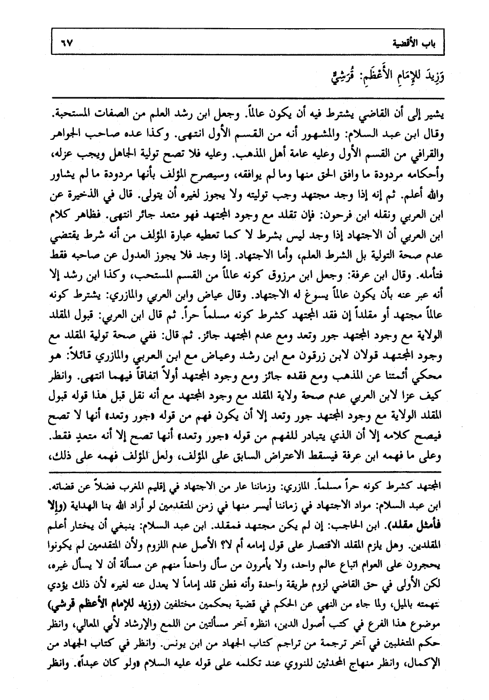 يشير إلى أن القاضي يشترط فيه أن يكون عالما وجعل ابن رشد العلم من الصفات المستحبة وقال ابن عبد السلام: والمشهور أنه من القسم الأول، انتهى. وكذا عده صاحب الجواهر والقرافي من القسم الأول، وعليه عامة أهل المذهب وعليه فلا تصح تولية الجاهل ويجب عزله وأحكامه مردودة ما وافق الحق منها وما لم يوافقه. وسيصرح المؤلف بأنها مردودة ما لم يشاور، والله أعلم. ثم إنه إذا وجد مجتهد وجب توليته ولا يجوز لغيره أن يتولى، قال في الذخيرة عن ابن العربي ونقله ابن فرحون: فإن تقلد مع وجود المجتهد فهو متعد جائر، انتهى. فظاهر كلام ابن العربي أن الاجتهاد إذا وجد ليس بشرط لا كما تعطيه عبارة المؤلف من أنه شرط يقتضي عدم صحة التولية بل الشرط العلم وأما الاجتهاد إذا وجد فلا يجوز العدول عن صاحبه فقط فتأمله وقال ابن عرفة: وجعل ابن مرزوق كونه عالما من القسم المستحب وكذا ابن رشد إلا أنه عبر عنه بأن يكون عالما يسوغ له الاجتهاد وقال عياض وابن العربي والمازري: يشترط كونه عالما مجتهدا أو مقلدا إن فقد المجتهد كشرط كونه مسلما حرا ثم قال ابن العربي: قبول المقلد الولاية مع وجود المجتهد جور وتعد ومع عدم المجتهد جائز ثم قال: ففي صحة تولية المقلد مع وجود المجتهد قولان لابن زرقون مع ابن رشد وعياض مع ابن العربي والمازري قائلا: هو محكى أئمتنا عن المذهب ومع فقده جائز ومع وجود المجتهد أو لا اتفاقا فيهما، انتهى. وانظر كيف عزا لابن العربي عدم صحة ولاية المقلد مع وجود المجتهد مع أنه نقل قبل هذا قوله: قبول المقلد الولاية مع وجود المجتهد جور وتعد، إلا أن يكون فهم من قوله: "جور وتعد" أنها لا تصح فيصح كلامه إلا أن الذي يتبادر للفهم من قوله: "جور وتعد" أنها تصح إلا أنه متعد فقط وعلى ما فهمه ابن عرفة فيسقط الاعتراض السابق على المؤلف ولعل المؤلف فهمه على ذلك