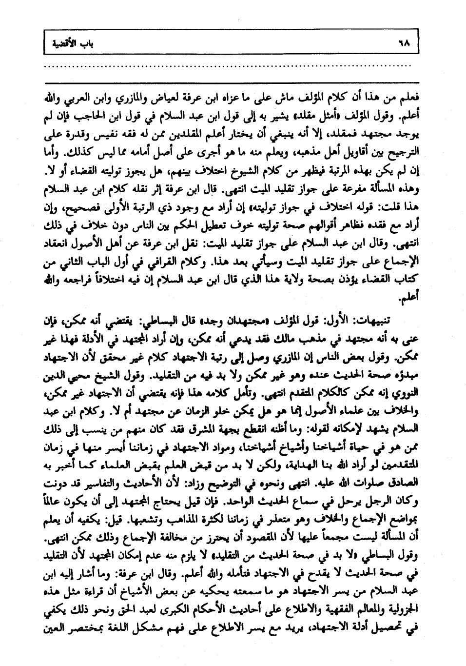 تنبيهات: الأول: قول المؤلف مجتهد إن وجد، قال البساطي: يقتضي أنه ممكن فإن عنى به أنه مجتهد في مذهب مالك فقد يدعى أنه ممكن وإن أراد المجتهد في الأدلة فهذا غير ممكن وقول بعض الناس أن المازري وصل إلى رتبة الاجتهاد كلام غير محقق؛ لأن الاجتهاد مبدؤه صحة الحديث عنده وهو غير ممكن ولا بد فيه من التقليد وقول الشيخ محيي الدين النووي: إنه ممكن كالكلام المتقدم، انتهى. وتأمل كلامه هذا فإنه يقتضي أن الاجتهاد غير ممكن والخلاف بين علماء الأصول إنما هو هل يمكن خلو الزمان عن مجتهد أم لا؟ وكلام ابن عبد السلام يشهد لإمكانه لقوله: وما أظنه انقطع بجهة المشرق فقد كان منهم من ينسب إلى ذلك ممن هو في حياة أشياخنا وأشياخ أشياخنا. ومواد الاجتهاد في زماننا أيسر منها في زمان المتقدمين لو أراد الله بنا الهداية، ولكن لا بد من قبض العلم بقبض العلماء كما أخبر به الصادق صلوات الله عليه، انتهى. ونحوه في التوضيح وزاد؛ لأن الأحاديث والتفاسير قد دونت وكان الرجل يرحل في سماع الحديث الواحد فإن قيل: يحتاج المجتهد إلى أن يكون عالما بمواضع الإجماع والخلاف، وهو متعذر في زماننا لكثرة المذاهب وتشعبها قيل: يكفيه أن يعلم أن المسألة ليست مجمعا عليها؛ لأن المقصود أن يحترز من مخالفة الإجماع وذلك ممكن، انتهى. وقول البساطي لا بد في صحة الحديث من التقليد لا يلزم منه عدم إمكان المجتهد؛ لأن التقليد في صحة الحديث لا يقدح في الاجتهاد فتأمله، والله أعلم. وقال ابن عرفة: وما أشار إليه ابن عبد السلام من يسر الاجتهاد هو ما سمعته يحكيه عن بعض الأشياخ أن قراءة مثل هذه الجزولية والمعالم الفقهية والاطلاع على أحاديث الأحكام الكبرى لعبد الحق ونحو ذلك يكفي في تحصيل أدلة الاجتهاد يريد مع يسر الاطلاع على فهم مشكل اللغة بمختصر العين