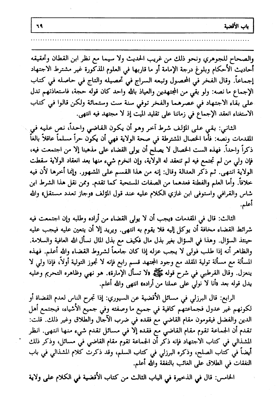 الثاني: بقي على المؤلف شرط آخر وهو أن يكون القاضي واحدا، نص عليه في المقدمات ونصه: فأما الخصال المشترطة في صحة الولاية فهي أن يكون حرا مسلما عاقلا بالغا ذكرا واحدا. فهذه الست الخصال لا يصلح أن يولى القضاء على مذهبنا إلا من اجتمعت فيه، فإن ولي من لم تجتمع فيه لم تنعقد له الولاية وإن انخرم شيء منها بعد انعقاد الولاية سقطت الولاية، انتهى. ثم ذكر العدالة وقال: إنه من هذا القسم على المشهور وإنما أخرها؛ لأن فيه خلافا وأما العلم والفطنة فعدهما من الصفات المستحبة كما تقدم وممن نقل هذا الشرط ابن شاس والقرافي واستوفى ابن غازي الكلام عليه عند قول المؤلف وجاز تعدد مستقل، والله أعلم.