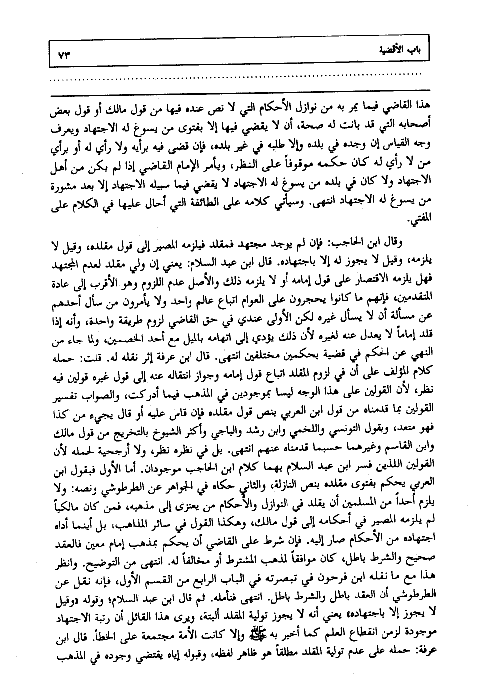 هذا القاضي فيما يمر به من نوازل الأحكام التي لا نص عنده فيها من قول مالك أو قول بعض أصحابه التي قد بانت له صحة أن لا يقضي فيها إلا بفتوى من يسوغ له الاجتهاد ويعرف وجه القياس إن وجده في بلده وإلا طلبه في غير بلده فإن قضى فيه برأيه ولا رأي له أو برأي من لا رأي له كان حكمه موقوفا على النظر ويأمر الإمام القاضي إذا لم يكن من أهل الاجتهاد ولا كان في بلده من يسوغ له الاجتهاد لا يقضي فيما سبيله الاجتهاد إلا بعد مشورة من يسوغ له الاجتهاد، انتهى. وسيأتي كلامه على الطائفة التي أحال عليها في الكلام على المفتي.
