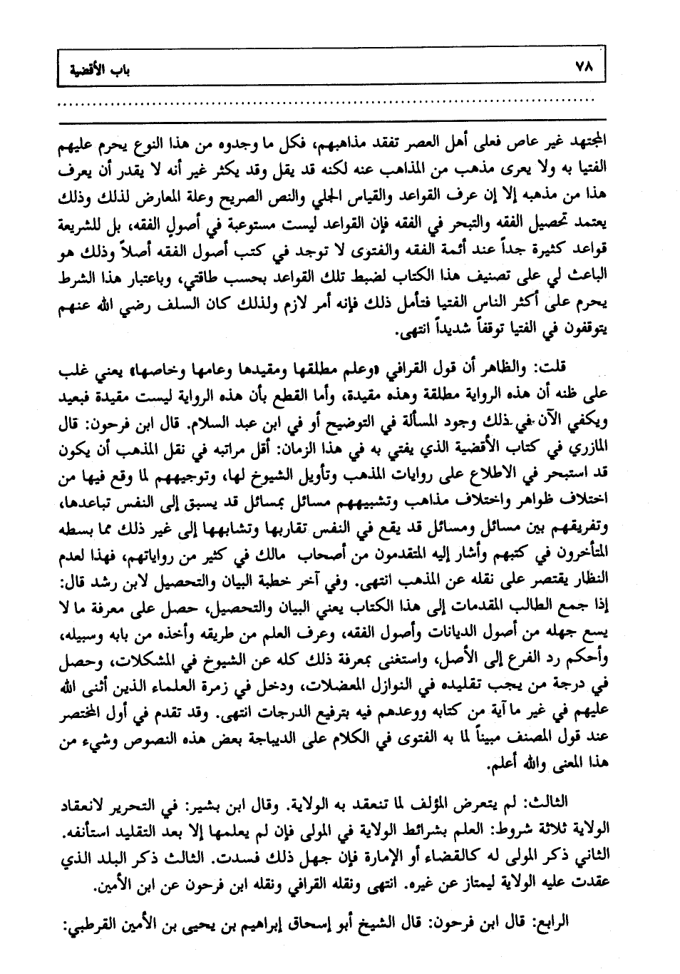 قلت: والظاهر أن قول القرافي: وعلم مطلقها ومقيدها وعامها وخاصها، يعني غلب على ظنه أن هذه الرواية مطلقة وهذه مقيدة وأما القطع بأن هذه الرواية ليست مقيدة فبعيد ويكفي الآن في ذلك وجود المسألة في التوضيح أو في ابن عبد السلام، قال ابن فرحون: قال المازري في كتاب الأقضية: الذي يفتى به في هذا الزمان أقل مراتبه في نقل المذهب أن يكون قد استبحر في الاطلاع على روايات المذهب وتأويل الشيوخ لها وتوجيههم لما وقع فيها من اختلاف ظواهر واختلاف مذاهب وتشبيههم مسائل بمسائل قد يسبق إلى النفس تباعدها وتفريقهم بين مسائل ومسائل قد يقع في النفس تقاربها وتشابهها إلى غير ذلك مما بسطه المتأخرون في كتبهم وأشار إليه المتقدمون من أصحاب مالك في كثير من رواياتهم فهذا لعدم النظار يقتصر على نقله عن المذهب، انتهى. وفي آخر خطبة البيان والتحصيل لابن رشد، قال: إذا جمع الطالب المقدمات إلى هذا الكتاب يعني البيان والتحصيل حصل على معرفة ما لا يسع جهله من أصول الديانات وأصول الفقه وعرف العلم من طريقه وأخذه من بابه وسبيله وأحكم رد الفرع إلى الأصل واستغنى بمعرفة ذلك كله عن الشيوخ في المشكلات وحصل في درجة من يجب تقليده في النوازل المعضلات ودخل في زمرة العلماء الذين أثنى الله عليهم في غير ما آية من كتابه ووعدهم فيه بترفيع الدرجات، انتهى. وقد تقدم في أول المختصر عند قول المصنف مبينا لما به الفتوى في الكلام على الديباجة بعض هذه النصوص وشيء من هذا المعنى، والله أعلم.