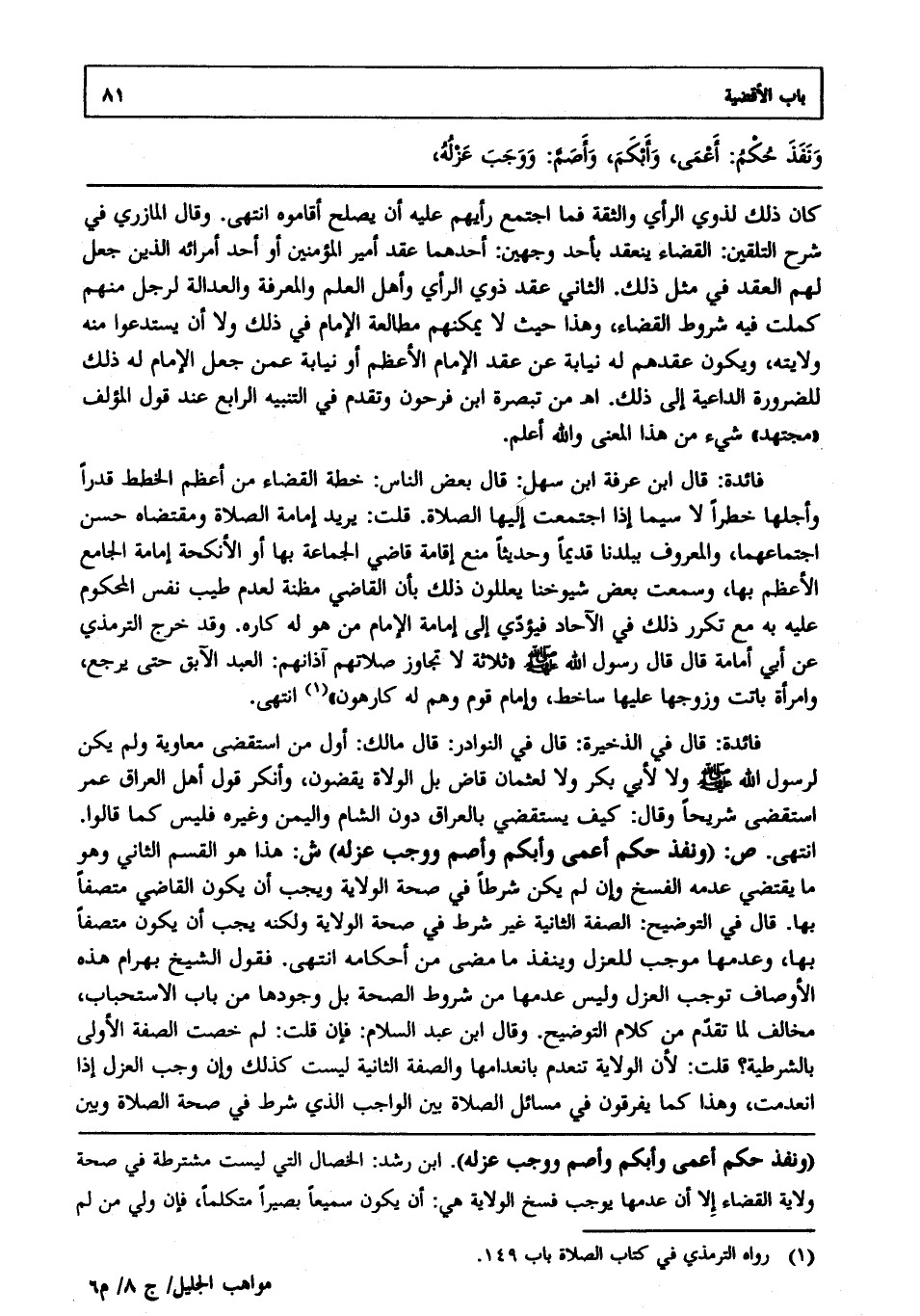 فائدة: قال في الذخيرة: قال في النوادر: قال مالك: أول من استقضى معاوية ولم يكن لرسول الله صلى الله عليه وسلم ولا لأبي بكر ولا لعثمان قاض بل الولاة يقضون وأنكر قول أهل العراق عمر استقضى شريحا وقال: كيف يستقضى بالعراق دون الشام واليمن وغيره فليس كما قالوا، انتهى. ص: (ونفذ حكم أعمى وأبكم وأصم ووجب عزله) ش: هذا هو القسم الثاني وهو ما يقتضي عدمه الفسخ وإن لم يكن شرطا في صحة الولاية ويجب أن يكون القاضي متصفا بها، قال في التوضيح: الصفة الثانية غير شرط في صحة الولاية ولكنه يجب أن يكون متصفا بها وعدمها موجب للعزل وينفذ ما مضى من أحكامه، انتهى. فقول الشيخ بهرام: هذه الأوصاف توجب العزل وليس عدمها من شروط الصحة بل وجودها من باب الاستحباب مخالف لما تقدم من كلام التوضيح. وقال ابن عبد السلام: فإن قلت: لم خصت الصفة الأولى بالشرطية؟ قلت:؛ لأن الولاية تنعدم بانعدامها والصفة الثانية ليست كذلك وإن وجب العزل إذا انعدمت وهذا كما يفرقون في مسائل الصلاة بين الواجب الذي