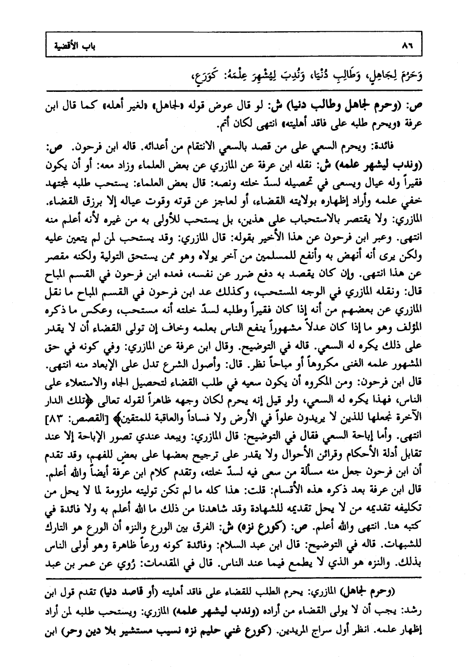 فائدة: ويحرم السعي على من قصد بالسعي الانتقام من أعدائه، قاله ابن فرحون. ص: (وندب ليشهر علمه) ش: نقله ابن عرفة عن المازري عن بعض العلماء وزاد معه أو أن يكون فقيرا وله عيال ويسعى في تحصيله لسد خلته ونصه: قال بعض العلماء: يستحب طلبه لمجتهد خفي علمه وأراد إظهاره بولايته القضاء أو لعاجز عن قوته وقوت عياله إلا برزق القضاء المازري ولا يقتصر بالاستحباب على هذين بل يستحب للأولى به من غيره؛ لأنه أعلم منه، انتهى. وعبر ابن فرحون عن هذا الأخير بقوله: قال المازري: وقد يستحب لمن لم يتعين عليه ولكن يرى أنه أنهض به وأنفع للمسلمين من آخر يولاه وهو ممن يستحق التولية ولكنه مقصر عن هذا، انتهى. وإن كان يقصد به دفع ضرر عن نفسه فعده ابن فرحون في القسم المباح، قال: ونقله المازري في الوجه المستحب، وكذلك عد ابن فرحون في القسم المباح ما نقل المازري عن بعضهم من أنه إذا كان فقيرا وطلبه لسد خلته أنه مستحب وعكس ما ذكره المؤلف وهو ما إذا كان عدلا مشهورا ينفع الناس بعلمه وخاف إن تولى القضاء أن لا يقدر على ذلك يكره له السعي، قاله في التوضيح وقال ابن عرفة عن المازري: وفي كونه في حق المشهور علمه الغني مكروها أو مباحا نظر، قال: وأصول الشرع تدل على الإبعاد منه، انتهى. قال ابن فرحون: ومن المكروه أن يكون سعيه في طلب القضاء لتحصيل الجاه والاستعلاء على الناس فهذا يكره له السعي ولو قيل: إنه يحرم لكان وجهه ظاهرا لقوله تعالى: {تِلْكَ الدَّارُ الْآخِرَةُ نَجْعَلُهَا لِلَّذِينَ لا يُرِيدُونَ عُلُوّاً فِي الْأَرْضِ وَلا فَسَاداً وَالْعَاقِبَةُ لِلْمُتَّقِينَ} [القصص:83] انتهى. وأما إباحة السعي فقال في التوضيح: قال المازري: ويبعد عندي تصور الإباحة إلا عند تقابل أدلة الأحكام وقرائن الأحوال ولا يقدر على ترجيح بعضها على بعض للفهم وقد تقدم أن ابن فرحون جعل منه مسألة من سعى فيه لسد خلته وتقدم كلام ابن عرفة أيضا، والله أعلم.