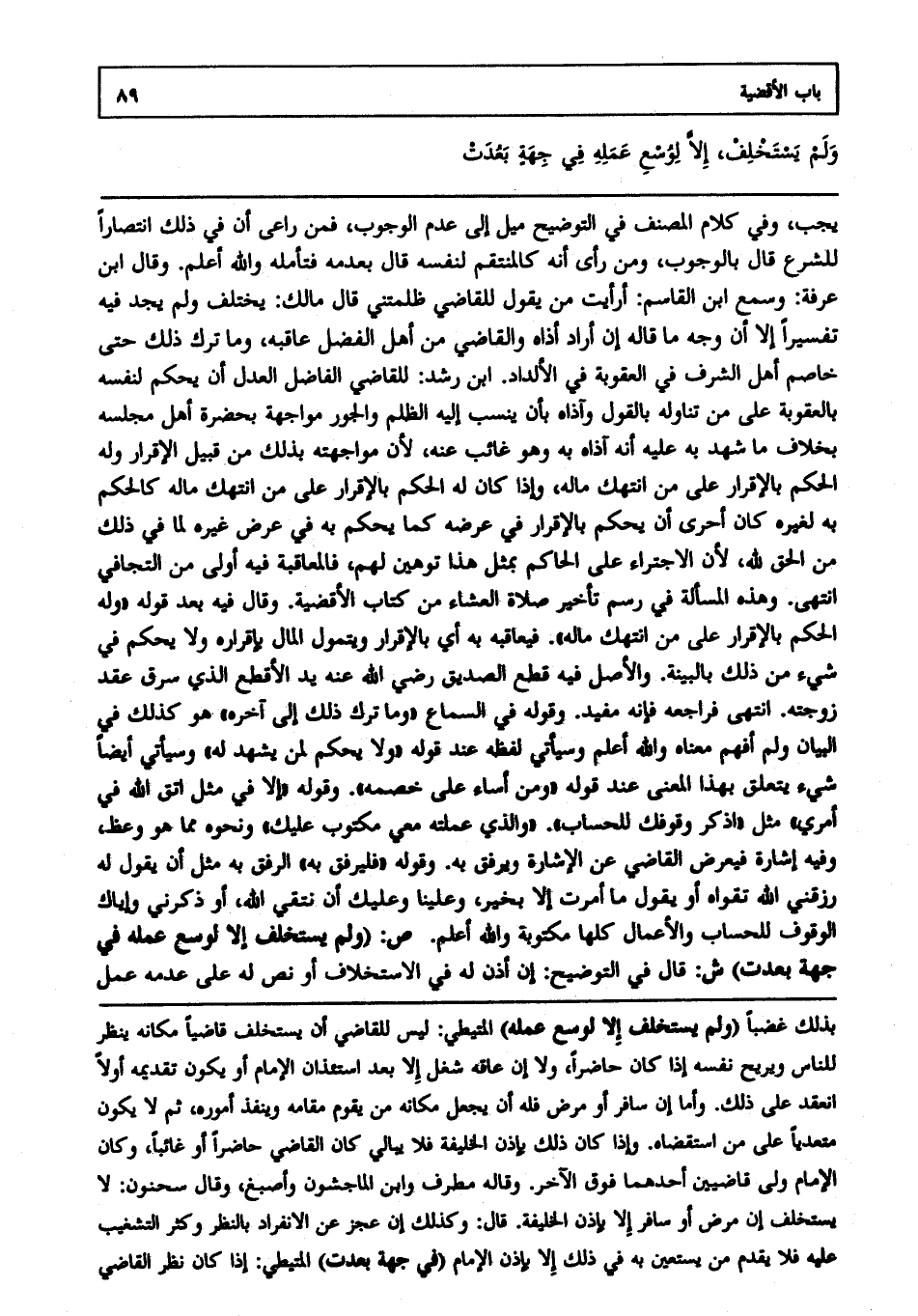 يجب وفي كلام المصنف في التوضيح ميل إلى عدم الوجوب فمن راعى أن في ذلك انتصارا للشرع، قال بالوجوب، ومن رأى أنه كالمنتقم لنفسه، قال بعدمه فتأمله، والله أعلم. وقال ابن عرفة: وسمع ابن القاسم أرأيت من يقول للقاضي: ظلمتني، قال مالك: يختلف ولم يجد فيه تفسيرا إلا أن وجه ما قاله إن أراد أذاه والقاضي من أهل الفضل عاقبه وما ترك ذلك حتى خاصم أهل الشرف في العقوبة في الإلداد. ابن رشد: للقاضي الفاضل العدل أن يحكم لنفسه بالعقوبة على من تناوله بالقول وآذاه بأن ينسب إليه الظلم والجور مواجهة بحضرة أهل مجلسه بخلاف ما شهد به عليه أنه آذاه به وهو غائب عنه؛ لأن مواجهته بذلك من قبيل الإقرار وله الحكم بالإقرار على من انتهك ماله وإذا كان له الحكم بالإقرار على من انتهك ماله كالحكم به لغيره كان أحرى أن يحكم بالإقرار في عرضه كما يحكم به في عرض غيره لما في ذلك من الحق لله؛ لأن الاجتراء على الحاكم بمثل هذا توهين لهم فالمعاقبة فيه أولى من التجافي، انتهى. وهذه المسألة في رسم تأخير صلاة العشاء من كتاب الأقضية، وقال فيه بعد قوله: "وله الحكم بالإقرار على من انتهك ماله" فيعاقبه به أي: بالإقرار ويتمول المال بإقراره ولا يحكم في شيء من ذلك بالبينة والأصل فيه قطع الصديق رضي الله عنه يد الأقطع الذي سرق عقد زوجته، انتهى. فراجعه فإنه مفيد، وقوله في السماع: "وما ترك ذلك، إلى آخره" هو كذلك في البيان ولم أفهم معناه، والله أعلم. وسيأتي لفظه عند قوله: "ولا يحكم لمن يشهد له" وسيأتي أيضا شيء يتعلق بهذا المعنى عند قوله: "ومن أساء على خصمه" وقوله: "إلا في مثل اتق الله في أمري" مثل اذكر وقوفك للحساب والذي عملته معي مكتوب عليك ونحوه مما هو وعظ وفيه إشارة فيعرض القاضي عن الإشارة ويرفق به وقوله: "فليرفق به" الرفق به مثل أن يقول له: رزقني الله تقواه أو يقول: ما أمرت إلا بخير وعلينا وعليك أن نتقي الله أو ذكرني وإياك الوقوف للحساب والأعمال كلها مكتوبة، والله أعلم. ص: (ولم يستخلف إلا لوسع عمله في جهة بعدت) ش: قال في التوضيح: إن أذن له في الاستخلاف أو نص له على عدمه عمل