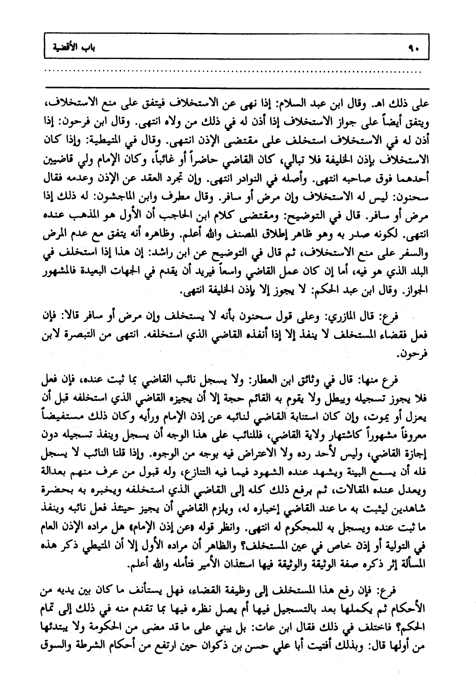 فرع: قال المازري: وعلى قول سحنون بأنه لا يستخلف وإن مرض أو سافر، قالا: فإن فعل فقضاء المستخلف لا ينفذ إلا إذا أنفذه القاضي الذي استخلفه، انتهى. من التبصرة لابن فرحون.