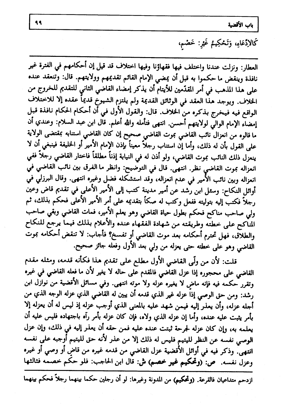 العطار: ونزلت عندنا واختلف فيها فقهاؤنا وفيها اختلاف، قد قيل إن أحكامهم في الفترة غير نافذة وينقض ما حكموا به قبل أن يمضي الإمام القائم تقديمهم وولايتهم، قال: وتنعقد عنده على هذا المذهب في أمر المقدمين للأيتام أن يذكر إمضاء القاضي الثاني للتقديم للخروج من الخلاف ويوجد هذا العقد في الوثائق القديمة ولم يلتزم الشيوخ قديما عقده إلا للاختلاف الواقع فيه فيخرج بذكره من الخلاف، قال: والقول الأول في أن أحكام الحكام نافذة قبل إمضاء الإمام الوالي لولايتهم أحسن، انتهى. فتأمله، والله أعلم. قال ابن عبد السلام: وعندي أن ما قالوه من انعزال نائب القاضي بموت القاضي صحيح إن كان القاضي استنابه بمقتضى الولاية على القول بأن له ذلك وأما إن استناب رجلا معينا بإذن الإمام الأمير أو الخليفة فينبغي أن لا ينعزل ذلك النائب بموت القاضي ولو أذن له في النيابة إذنا مطلقا فاختار القاضي رجلا ففي انعزاله بموت القاضي نظر، انتهى. قال في التوضيح: وانظر ما الفرق بين نائب القاضي في انعزاله وبين نائب الأمير في عدم انعزاله وقد استشكله فضل وغيره، انتهى. وقال البرزلي في أوائل النكاح: وسئل ابن رشد عن أمير مدينة كتب إلى الأمير الأعلى في تقديم قاض وعين رجلا فكتب إليه بتوليته ففعل وكتب له صكا بتقديمه على أمر الأمير الأعلى فحكم بذلك ثم ولى صاحب مناكح فحكم بطول حياة القاضي وهو يعلم الأمير فمات القاضي وبقي صاحب المناكح على خطته وطريقته من شهادة الفقهاء عنده والإعلام بذلك فيما يرجع للنكاح والطلاق فهل تحترم أحكامه بعد موت القاضي أو تفسخ فأجاب لا تنقض أحكامه بموت القاضي وهو على خطته حتى يعزله من ولي بعد الأول، وفعله جائز صحيح