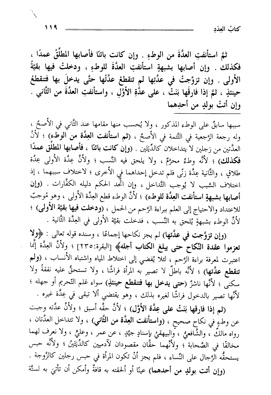 سببها على الوطء المذكور ولا يحسب منها مقامها عند الثاني في الأصح وله رجعة الرجعية في التتمة في الأصح "ثم استأنفت العدة من الوطء" لأن العدتين من رجلين لا يتداخلان كالديتين "وإن كانت بائنا فأصابها المطلق عمدا فكذلك" لأنه وطء محرم ولا يلحق فيه النسب ولأن عدة الأولى عدة طلاق والثانية عدة زنى فلم تدخل إحداهما في الأخرى لاختلاف سببهما إذ اختلاف السبب لا يوجب التداخل وإن اتحد الحكم دليله الكفارات "وإن أصابها بشبهة استأنفت العدة للوطء" لأن الوطء قطع العدة الأولى وهو موجب للاعتداد والاحتياج إلى العلم ببراءة الرحم من الحمل "ودخلت فيها بقية الأولى" لأن الوطء بشبهة يلحق به النسب فدخلت بقية الأولى في العدة الثانية.
