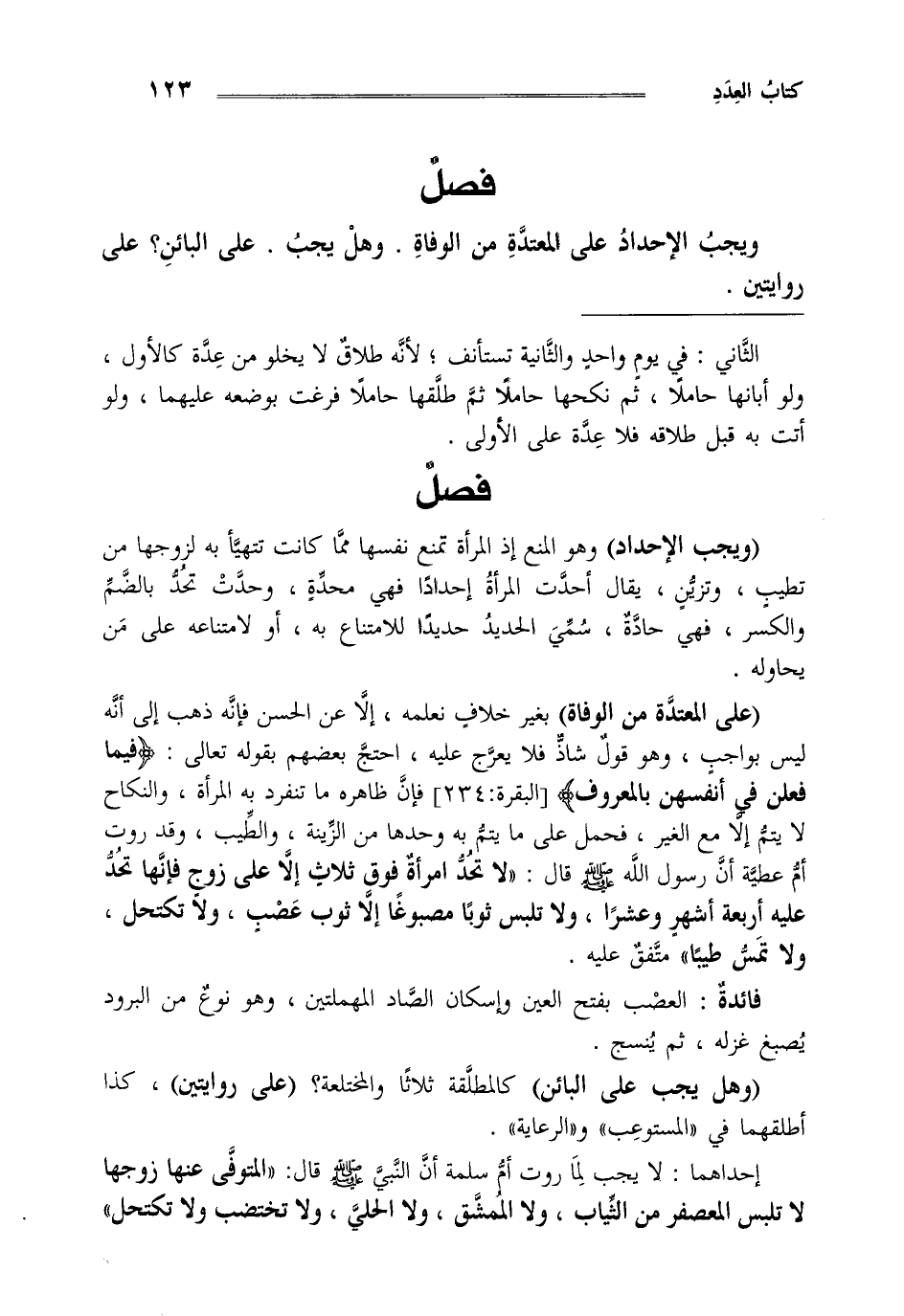 "على المعتدة من الوفاة" بغير خلاف نعلمه إلا عن الحسن فإنه ذهب إلى أنه ليس بواجب وهو قول شاذ فلا يعرج عليه احتج بعضهم ب قوله تعالى: {فِيمَا فَعَلْنَ فِي أَنْفُسِهِنَّ بِالْمَعْرُوفِ} [البقرة:234] فإن ظاهره ما تنفرد به المرأة والنكاح لا يتم إلا مع الغير فحمل على ما يتم به وحدها من الزينة والطيب وقد روت أم عطية أن رسول الله صلى الله عليه وسلم قال: "لا تحد امرأة فوق ثلاث إلا على زوج فإنها تحد عليه أربعة أشهر وعشرا ولا تلبس ثوبا مصبوغا إلا ثوب عصب ولا تكتحل ولا تمس طيبا" متفق عليه.