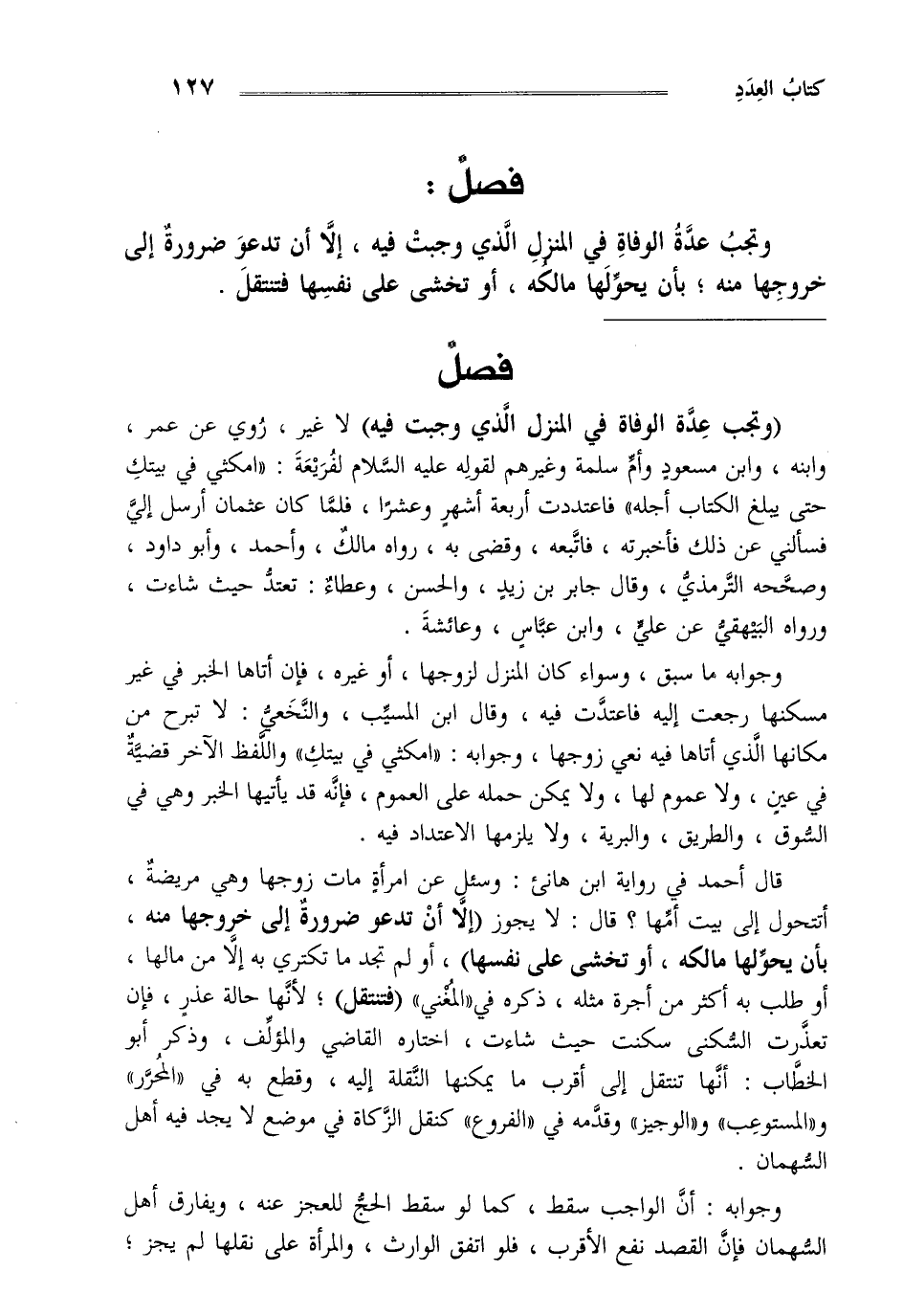 وجوابه ما سبق وسواء كان المنزل لزوجها أو غيره فإن أتاها الخبر في غير مسكنها رجعت إليه فاعتدت فيه وقال ابن المسيب والنخعي لا تبرح من مكانها الذي أتاها فيه نعي زوجها وجوابه "امكثي في بيتك" واللفظ الآخر قضية في عين ولا عموم لها ولا يمكن حمله على العموم فإنه قد يأتيها الخبر وهي في السوق والطريق والبرية ولا يلزمها الاعتداد فيه قال أحمد في رواية ابن هانئ وسئل عن امرأة مات زوجها وهي مريضة أتتحول إلى بيت أمها قال "لا يجوز إلا أن تدعو ضرورة إلى خروجها منه بأن يحولها مالكه أو تخشى على نفسها" أو لم تجد ما تكتري به إلا من مالها أو طلب به أكثر من أجرة مثله ذكره في المغني "فتنتقل" لأنها حالة عذر فإن تعذرت السكنى سكنت حيث شاءت اختاره القاضي والمؤلف وذكر أبو الخطاب أنها تنتقل إلى أقرب ما يمكنها النقلة إليه وقطع به في "المحرر" و"المستوعب" و"الوجيز" وقدمه في "الفروع" كنقل الزكاة في موضع لا يجد فيه أهل السهمان.