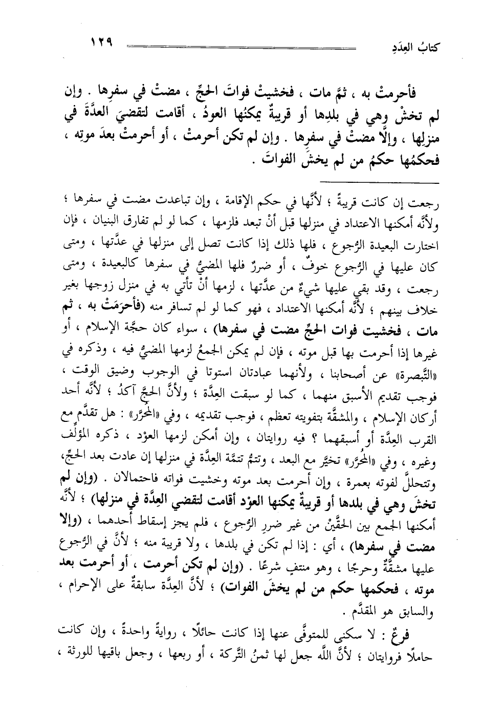 رجعت إن كانت قريبة لأنها في حكم الإقامة وإن تباعدت مضت في سفرها ولأنه أمكنها الاعتداد في منزلها قبل أن تبعد فلزمها كما لو لم تفارق البنيان فإن اختارت البعيدة الرجوع فلها ذلك إذا كانت تصل إلى منزلها في عدتها ومتى كان عليها في الرجوع خوف أو ضرر فلها المضي في سفرها كالبعيدة ومتى رجعت وقد بقي عليها شيء من عدتها لزمها أن تأتي به في منزل زوجها بغير خلاف بينهم لأنه أمكنها الاعتداد فهو كما لو لم تسافر منه "فأحرمت به ثم مات فخشيت فوات الحج مضت في سفرها" سواء كان حجة الإسلام أو غيرها إذا أحرمت بها قبل موته فإن لم يمكن الجمع لزمها المضي فيه وذكره في "التبصرة" عن أصحابنا ولأنهما عبادتان استوتا في الوجوب وضيق الوقت فوجب تقديم الأسبق منهما كما لو سبقت العدة ولأن الحج آكد لأنه أحد أركان الإسلام والمشقة بتفويته تعظم فوجب تقديمه وفي "المحرر" هل تقدم مع القرب العدة أو أسبقهما فيه روايتان وإن أمكن لزمها العود ذكره المؤلف وغيره وفي المحرر تخير مع البعد وتتم تتمة العدة في منزلها إن عادت بعد الحج وتتحلل لفوته بعمرة وإن أحرمت بعد موته وخشيت فواته فاحتمالان "وإن لم تخش وهي في بلدها أو قريبة يمكنها العود أقامت لتقضي العدة في منزلها" لأنه أمكنها الجمع بين الحقين من غير ضرر الرجوع فلم يجز إسقاط أحدهما وإلا "مضت في سفرها" أي إذا لم تكن في بلدها ولا قريبة منه لأن في الرجوع عليها مشقة وحرجا وهو منتف شرعا "وإن لم تكن أحرمت أو أحرمت بعد موته فحكمها حكم من لم يخش الفوات" لأن العدة سابقة على الإحرام والسابق هو المقدم.
