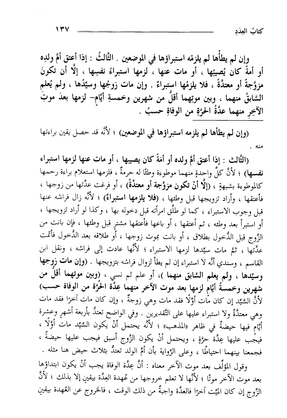"الثالث إذا أعتق أم ولده أو أمة كان يصيبها أو مات عنها لزمها استبراء نفسها" لأن كل واحدة منهما موطوءة وطئا له حرمة فلزمها استعلام براءة رحمها كالموطوءة بشبهة "إلا أن تكون مزوجة أو معتدة" أو فرغت عدتها من زوجها فأعتقها وأراد تزويجها قبل وطئها "فلا يلزمها استبراء" لأنه زال فراشه عنها قبل وجوب الاستبراء كما لو طلق امرأته قبل دخوله بها وكذا لو أراد تزويجها أو استبرأ بعد وطئه ثم أعتقها أو باعها فأعتقها مشتر قبل وطئها فإن بانت من الزوج قبل الدخول بطلاق أو بانت بموت زوجها أو طلاقه بعد الدخول فأتمت عدتها ثم مات سيدها لزمها الاستبراء لأنها عادت إلى فراشه ونقل ابن القاسم وسندي أنه لا استبراء إن لم يطأ لزوال فراشه بتزويجها "وإن مات زوجها وسيدها ولم يعلم السابق منهما" أو علم ثم نسي "وبين موتها أقل من شهرين وخمسة أيام لزمها بعد موت الأخر منهما عدة الحرة من الوفاة حسب" لأن السيد إن كان مات أولا فقد مات وهي زوجة وإن كان مات آخرا فقد مات وهي معتدة ولا استبراء عليها على التقديرين وفي الواضح تعتد بأربعة أشهر وعشرة أيام فيها حيضة في ظاهر "المذهب" لأنه يحتمل أن يكون السيد مات أولا فيجب عليها عدة حرة ويحتمل أن يكون الزوج أسبق فيجب عليها حيضة فجمعنا بينهما احتياطا وعلى الرواية بأن أم الولد تعتد بثلاث حيضات هنا مثله.