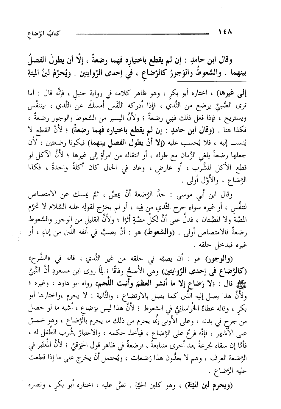 و قال ابن أبي موسى حد الرضعة أن يمص ثم يمسك عن الامتصاص لتنفس أو غيره سواء خرج الثدي من فيه أو لم يخرج لقوله عليه السلام لا تحرم المصة و لا المصتان فدل على أن لكل مصة أثرا و لأن القليل من الوجور "و السعوط" رضعة فالامتصاص أولى "و السعوط" هو أن يصب في أنفه اللبن من إناء أو غيره فيدخل حلقه.