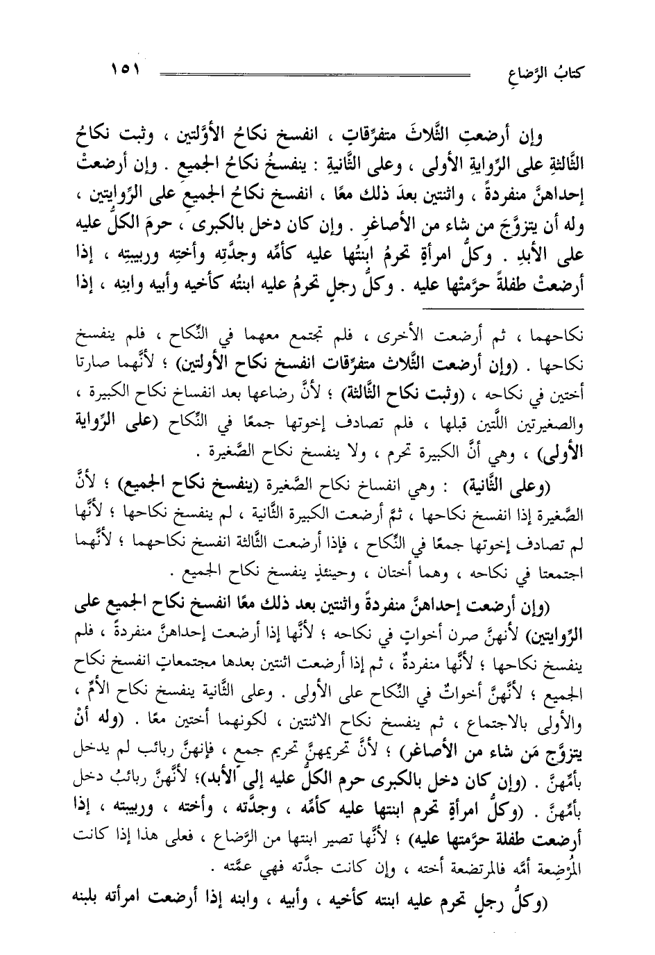 وإن أرضعت الثلاث متفرقات ، انفسخ نكاح الأولتين ، وثبت نكاح الثالثة على الرواية الأولى وعلى الثانية ينفسخ نكاح الجميع وإن أرضعت إحداهن منفردة ، واثنتين بعد ذلك معا انفسخ نكاح الجميع على الروايتين وله أن يتزوج من شاء من الأصاغر وإن كان دخل بالكبرى ، حرم الكل عليه على الأبد وكل امرأة تحرم ابنتها عليه كأمه وجدته وأخته وربيبته ، إذا أرضعت طفلة حرمتها عليه . وكل رجل تحرم عليه ابنته كأخيه وأبيه وابنه إذا