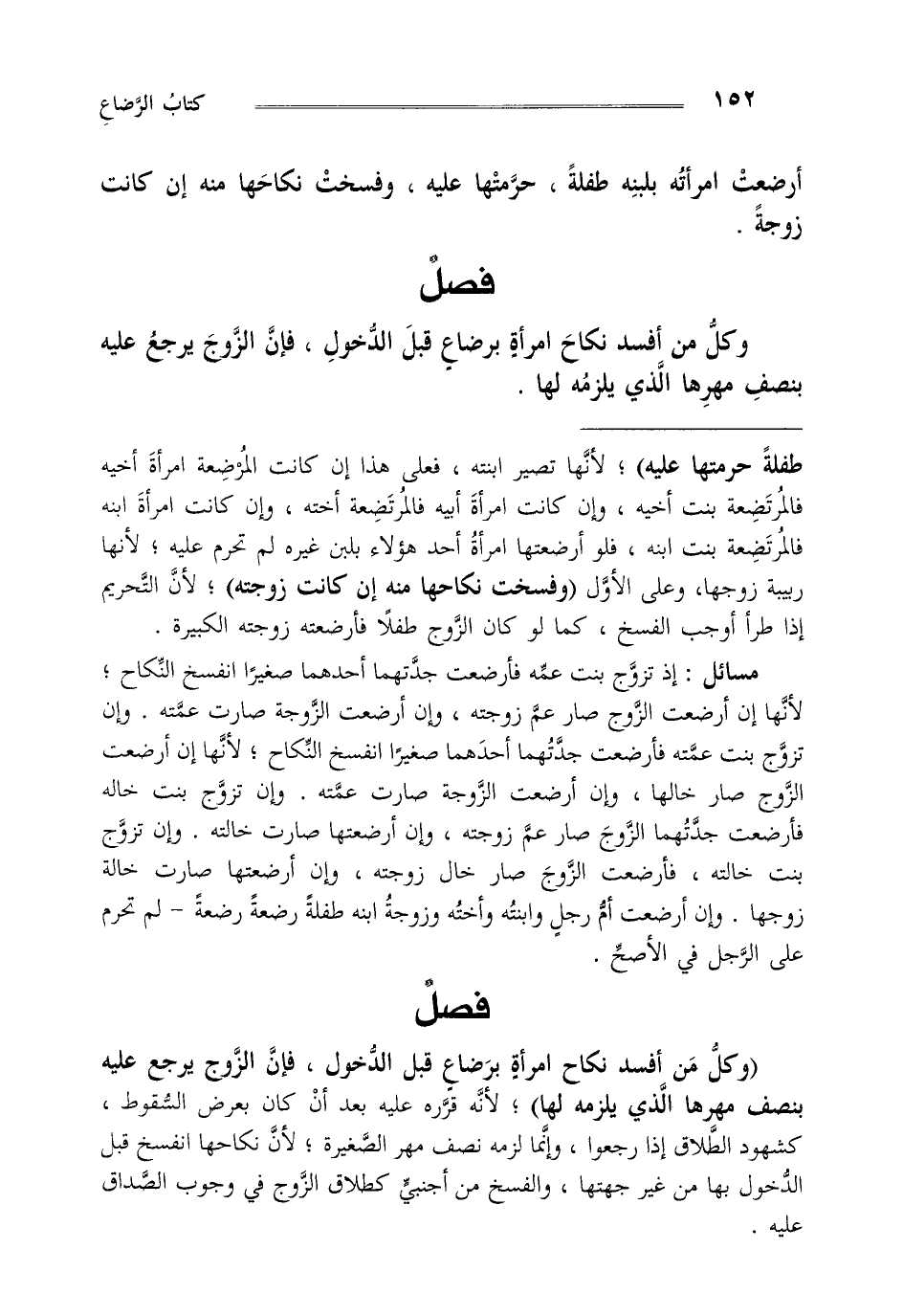 مسائل : إذ تزوج بنت عمه فأرضعت جدتهما أحدهما صغيرا انفسخ النكاح لأنها إن أرضعت الزوج صار عم زوجته وإن أرضعت الزوجة صارت عمته وإن تزوج بنت عمته فأرضعت جدتهما أحدهما صغيرا انفسخ النكاح لأنها إن أرضعت الزوج صار خالها وإن أرضعت الزوجة صارت عمته وإن تزوج بنت خاله فأرضعت جدتهما الزوج صار عم زوجته وإن أرضعتهما صارت خالته وإن تزوج بنت خالته فأرضعت الزوج صار خال زوجته وإن أرضعتها صارت خالة زوجها وإن أرضعت أم رجل و ابنته و أخته وزوجة ابنه طفلة رضعة رضعة لم تحرم على الرجل في الأصح.