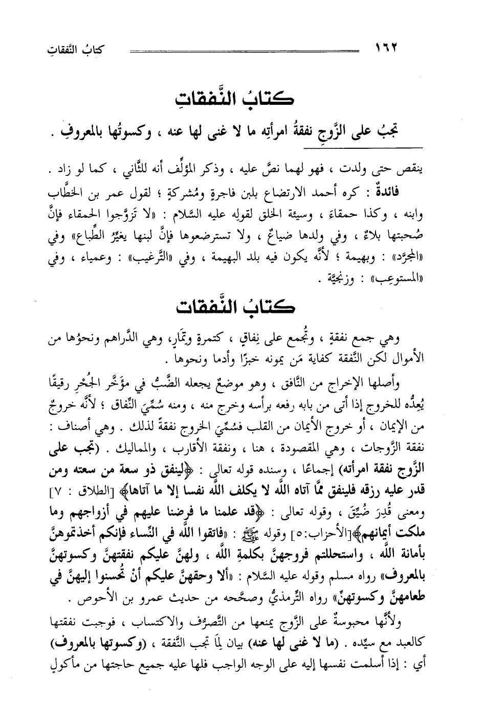 و أصلها الإخراج من النافق و هو موضع يجعله الضب في مؤخر الحجر رقيقا يعده للخروج إذا أتى من بابه رفعه برأسه و خرج منه ومنه سمي النفاق لأنه خروج من الإيمان أو خروج الإيمان من القلب فسمي الخروج نفقة لذلك و هي أصناف نفقة الزوجات وهي المقصودة هنا و نفقة الأقارب و المماليك "تجب على الزوج نفقة امرأته" إجماعا و سنده قوله تعالى: {لِيُنْفِقْ ذُو سَعَةٍ مِنْ سَعَتِهِ وَمَنْ قُدِرَ عَلَيْهِ رِزْقُهُ فَلْيُنْفِقْ مِمَّا آتَاهُ اللَّهُ لا يُكَلِّفُ اللَّهُ نَفْساً إِلَّا مَا آتَاهَا} [الطلاق: 7] و معنى قدر ضيق وقوله تعالى: {قَدْ عَلِمْنَا مَا فَرَضْنَا عَلَيْهِمْ فِي أَزْوَاجِهِمْ وَمَا مَلَكَتْ أَيْمَانُهُمْ} [الأحزاب: 50] وقوله صلى الله عليه وسلم "فاتقوا الله في النساء فإنكم أخذتموهن بأمانة الله واستحللتم فروجهن بكلمة الله و لهن عليكم نفقتهن وكسوتهن بالمعروف" رواه مسلم و قوله عليه السلام "ألا وحقهن عليكم أن تحسنوا إليهن في طعامهن و كسوتهن" رواه الترمذي و صححه من حديث عمرو بن الأحوص.