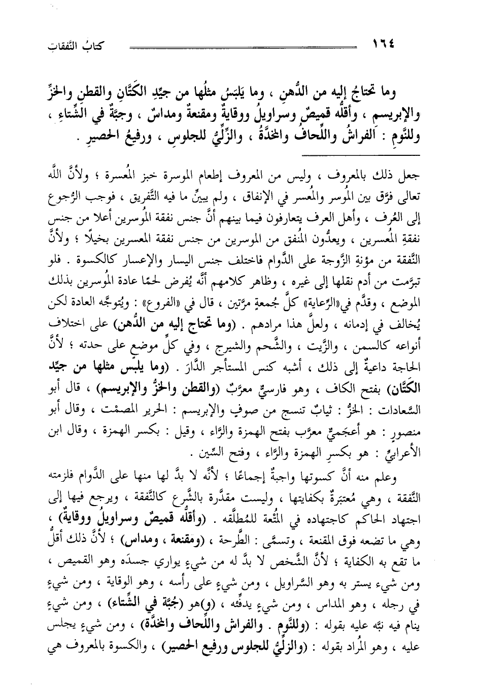 و ما تحتاج إليه من الدهن و ما يلبس مثلها من جيد الكتان و القطن و الخز والإبريسم واقله قميص وسراويل ووقاية ومقنعة ومداس وجبة في الشتاء وللنوم الفراش واللحاف والمخدة والزلي للجلوس ورفيع الحصير.