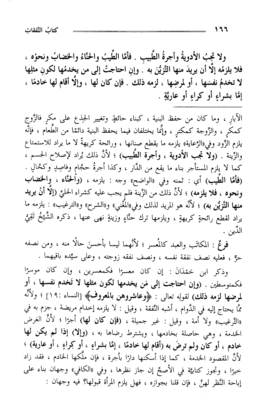 الآبار وما كان من حفظ البنية كبناء حائط و تغيير الجذع على مكر فالزوج كمكر و الزوجة كمكتر و إنما يختلفان فيما يحفظ البنية دائما من الطعام فإنه يلزم الزود وفي "الرعاية" يلزمه ما يقطع صنانها ورائحة كريهة لا ما يراد للاستمتاع و الزينة "و لا تجب الأدوية وأجرة الطبيب" لأن ذلك يراد لإصلاح الجسم كما لا يلزم المستأجر بناء ما يقع من الدار و كذا أجرة حجام وفاصد و كحال "فأما الطيب" أي ثمنه و في الواضح وجه يلزمه "و الحناء و الخضاب و نحوه فلا يلزمه" لأن ذلك من الزينة فلم يجب عليه كشراء الحلي "إلا أن يريد منها التزين به" لأنه هو المريد لذلك وفي "المغني" و"الشرح" و"الترغيب" يلزمه ما يراد لقطع رائحة كريهة و يلزمها ترك حناء وزينة نهي عنها ذكرها الشيخ تقي الدين.