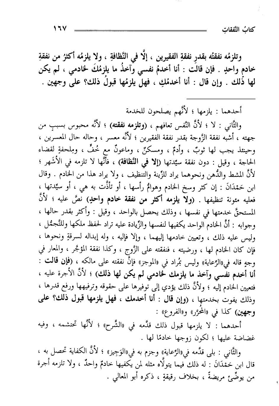 و الثاني: لا لأن النفس تعافهم "وتلتزم نفقته" لأنه محبوس بسبب من جهته أشبه نفقة الزوجة بقدر نفقة الفقيرين لأنه معسر وحاله حال المعسرين و حينئذ يجب لها ثوب وأدم و مسكن و ماعون مع خف و ملحفة لقضاء الحاجة وقيل دون نفقة سيدها "إلا في النظافة" فإنها لا تلزمه في الأشهر لأن المشط و الدهن و نحوهما يراد للزينة و التنظيف و لا يراد هذا من الخادم و قال ابن حمدان إن كثر وسخ الخادم و هوام رأسها أو تأذت به هي أو سيدتها فعليه مؤونة تنظيفها "و لا يلزمه أكثر من نفقة خادم واحد" نص عليه لأن المستحق خدمتها في نفسها وذلك يحصل بالواحد و قيل وأكثر بقدر حالها و جوابه أن الخادم الواحد يكفيها لنفسها و الزيادة عليه تراد لحفظ ملكها و للتجمل و ليس عليه ذلك و تعيين خادمها إليهما وإلا فإليه وله إبداله لسرقة و نحوها فإن كان الخادم لها ورضيته فنفقته على الزوج و كذا نفقة المؤجر و المعار في وجه قاله في "الرعاية" و ليس بمراد في ا"لموجز" "فإن نفقته على مالكه فإن قالت أنا أخدم نفسي وآخذ ما يلزمك لخادمي لم يكن لها ذلك" لأن الأجرة عليه فتعيين الخادم إليه ولأن ذلك يؤدي إلى توفيرها على حقوقه و ترفيهها ورفع قدرها وذلك يفوت بخدمتها "وإن قال أنا أخدمك فهل يلزمها قبول ذلك على وجهين" كذا في "المحرر" و"الفروع".