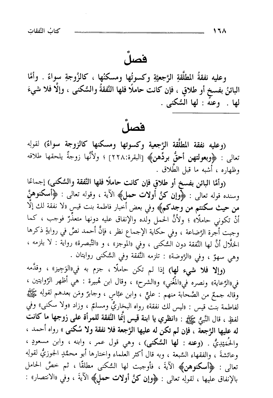 "و أما البائن بفسخ أو طلاق فإن كانت حاملا فلها النفقة و السكنى" إجماعا وسنده قوله تعالى: {وَإِنْ كُنَّ أُولاتِ حَمْلٍ} [الطلاق:6] الآية و قوله تعالى: {أَسْكِنُوهُنَّ مِنْ حَيْثُ سَكَنْتُمْ مِنْ وُجْدِكُمْ } [الطلاق:6] وفي بعض أخبار فاطمة بنت قيس "لا نفقة لك إلا أن تكوني حاملا" ولأن الحمل ولده و الإنفاق عليه دونها متعذر فوجب كما وجبت أجرة الرضاعة وفي حكاية لإجماع نظر فإن أحمد نص في رواية ذكرها الخلال أن لها النفقة دون السكنى و في "الموجز" "التبصرة" رواية لا يلزمه وهي سهو وفي "الروضة" تلزمه النفقة وفي السكنى روايتان.