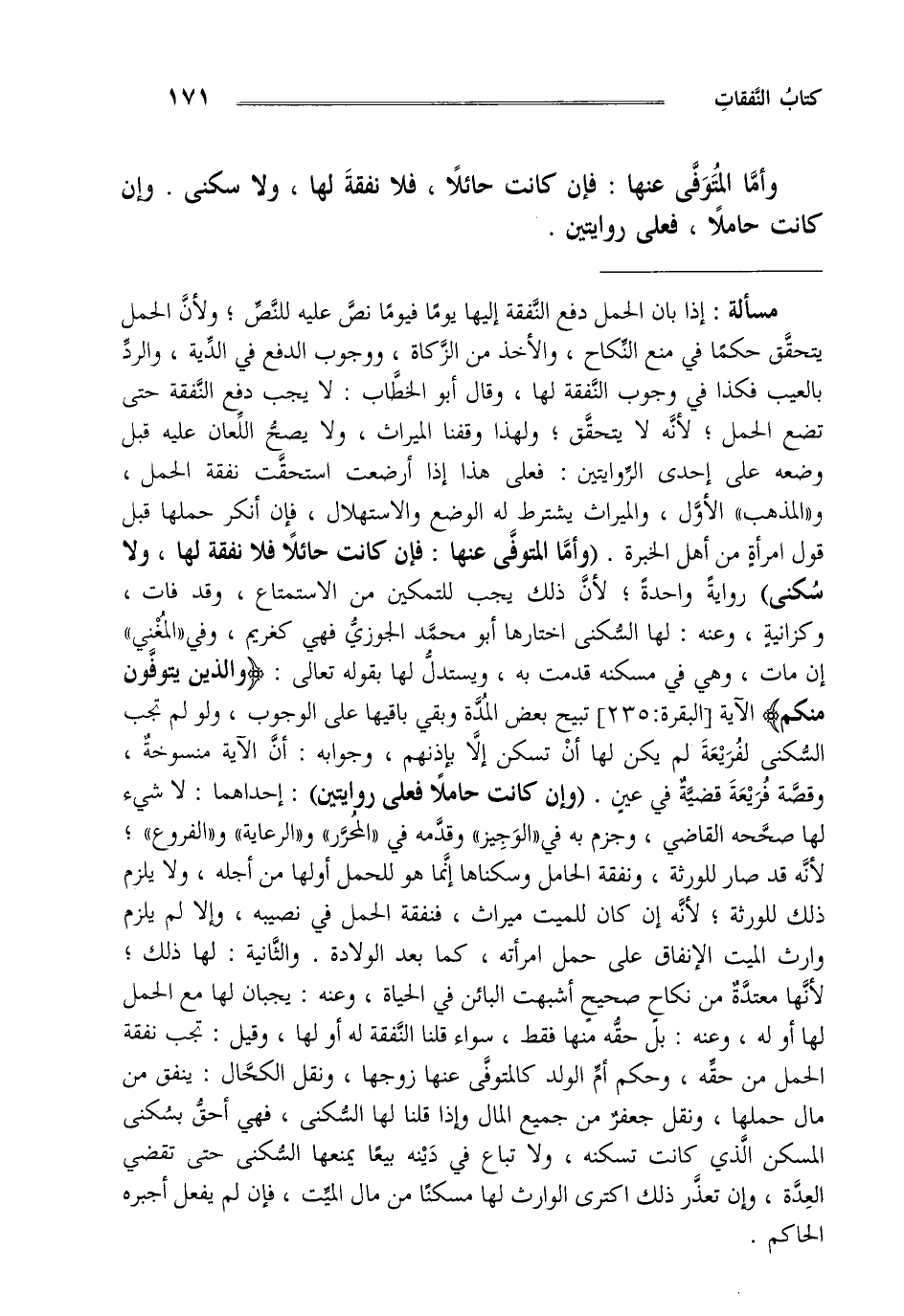 مسألة : إذا بان الحمل دفع النفقة إليها يوما فيوما نص عليه للنص ولأن الحمل يتحقق حكما في منع النكاح والأخذ من الزكاة ووجوب الدفع في الدية والرد بالعيب فكذا في وجوب النفقة لها وقال أبو الخطاب لا يجب دفع النفقة حتى تضع الحمل لأنه لا يتحقق ولهذا وقفنا الميراث ولا يصح اللعان عليه قبل وضعه على إحدى الروايتين فعلى هذا إذا أرضعت استحقت نفقة الحمل و"المذهب" الأول والميراث يشترط له الوضع والاستهلال فإن أنكر حملها قبل قول امرأة من أهل الخبرة "وأما المتوفى عنها فإن كانت حائلا فلا نفقة لها ولا سكنى" رواية واحدة لأن ذلك يجب للتمكين من الاستمتاع وقد فات وكزانية وعنه لها السكنى اختارها أبو محمد الجوزي فهي كغريم وفي "المغني" إن مات وهي في مسكنه قدمت به ويستدل لها ب قوله تعالى: {وَالَّذِينَ يُتَوَفَّوْنَ مِنْكُمْ} [البقرة:234] تبيح بعض المدة وبقي باقيها على الوجوب ولو لم تجب السكنى لفريعة لم يكن لها أن تسكن إلا بإذنهم وجوابه أن الآية منسوخة وقصة فريعة قضية في عين "وإن كانت حاملا فعلى روايتين" إحداهما لا شيء لها صححه القاضي وجزم به في "الوجيز" وقدمه في "المحرر" و"الرعاية" و"الفروع" لأنه قد صار للورثة ونفقة الحامل وسكناها إنما هو للحمل أولها من أجله ولا يلزم ذلك للورثة لأنه إن كان للميت ميراث فنفقة الحمل في نصيبه وإلا لم يلزم وارث الميت الإنفاق على حمل امرأته كما بعد الولادة والثانية لها ذلك لأنها معتدة من نكاح صحيح أشبهت البائن في الحياة وعنه يجبان لها مع الحمل لها أو له وعنه بل حقه منها فقط سواء قلنا النفقة له أو لها وقيل تجب نفقة الحمل من حقه وحكم أم الولد كالمتوفى عنها زوجها ونقل الكحال ينفق من مال حملها ونقل جعفر من جميع المال وإذا قلنا لها السكنى فهي أحق بسكنى المسكن الذي كانت تسكنه ولا تباع في دينه بيعا يمنعها السكنى حتى تقضي العدة وإن تعذر ذلك اكترى الوارث لها مسكنا من مال الميت فإن لم تفعل أجبره الحاكم.
