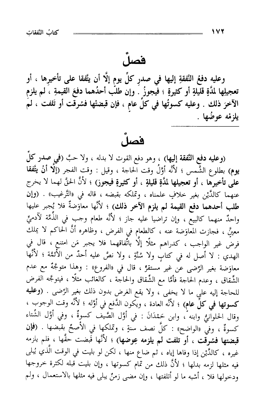 "وعليه دفع النفقة إليها" وهو دفع القوت لا بدله ولا حب "في صدر كل يوم" بطلوع الشمس لأنه أول وقت الحاجة وقيل وقت الفجر "إلا أن يتفقا على تأخيرها أو تعجيلها لمدة قليلة أو كثيرة فيجوز" لأن الحق لهما لا يخرج عنهما كالدين بغير خلاف علمناه وتملكه بقبضه قاله في الترغيب "وإن طلب أحدهما دفع القيمة لم يلزم الآخر ذلك" لأنها معاوضة فلا يجبر عليها واحد منهما كالبيع وإن تراضيا عليه جاز لأنه طعام وجب في الذمة لآدمي معين فجازت المعاوضة عنه كالطعام في الفرض وظاهره أن الحاكم لا يملك الواجب كدراهم مثلا إلا باتفاقهما فلا يجبر من امتنع قال في الهدي لا أصل له في كتاب ولا سنة ولا نص عليه أحد من الأئمة لأنها معاوضة بغير الرضى عن غير مستقر قال في "الفروع" وهذا متوجه مع عدم الشقاق وعدم الحاجة فأما مع الشقاق والحاجة كالغائب مثلا فيتوجه الفرض للحاجة إليه على ما لا يخفى ولا يقع الغرض بدون ذلك بغير الرضى "وعليه كسوتها في كل عام" لأنه العادة ويكون الدفع في أوله لأنه وقت الوجوب وقال الحلواني وابنه وابن حمدان في أول الصيف كسوة وفي أول الشتاء كسوة وفي "الواضح" كل نصف سنة وتملكها في الأصح بقبضها "فإن قبضتها فسرقت أو تلفت لم يلزمه عوضها" لأنها قبضت حقها فلم يلزمه غيره كالدين إذا وفاها إياه ثم ضاع منها لكن لو بليت في الوقت الذي يبلى فيه مثلها لزمه بدلها لأن ذلك من تمام كسوتها وإن بليت قبله لكثرة خروجها ودخولها فلا أشبه ما لو أتلفتها وإن مضى زمن يبلى فيه مثلها بالاستعمال ولم