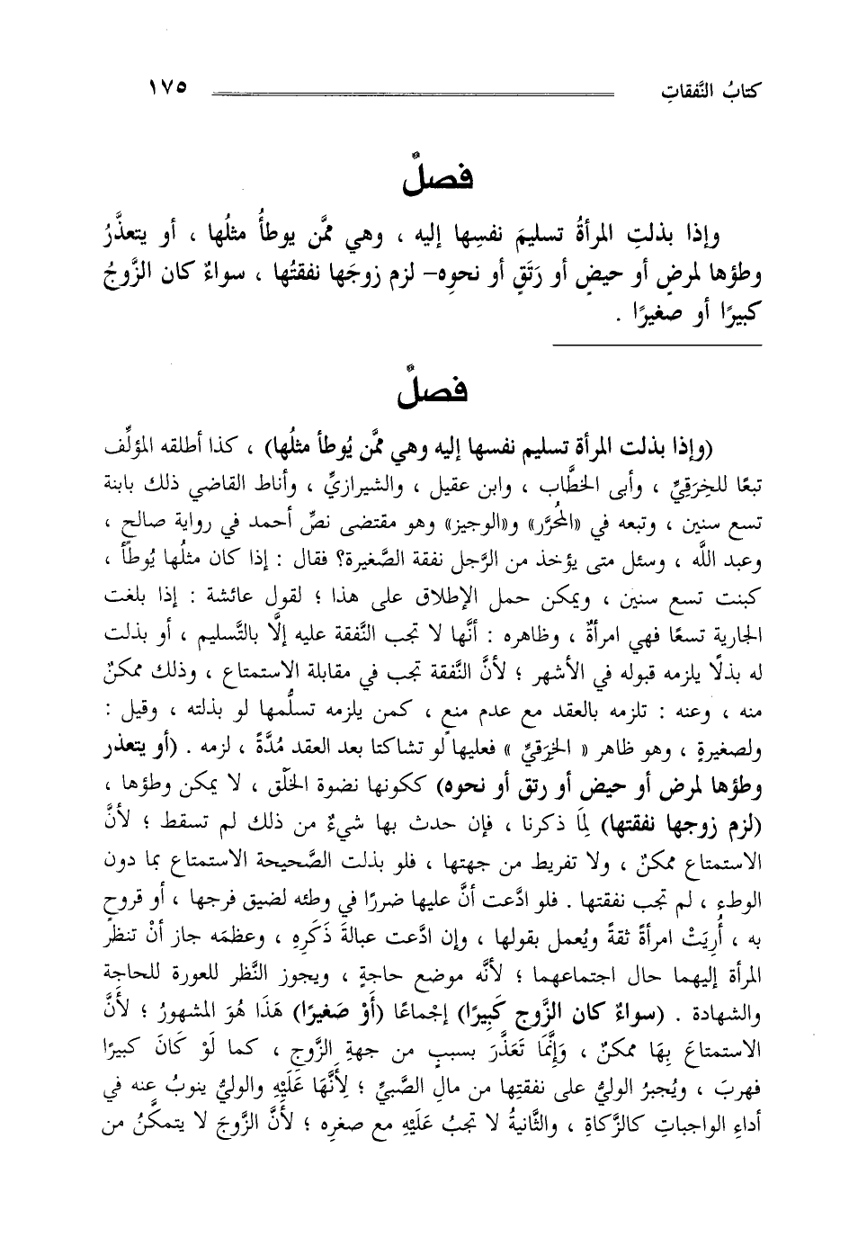 "وإذا بذلت المرأة تسليم نفسها إليه وهي ممن يوطأ مثلها" كذا أطلقه المؤلف تبعا للخرقي وأبي الخطاب وابن عقيل والشيرازي وأناط القاضي ذلك بابنة تسع سنين وتبعه في "المحرر" و "الوجيز" وهو مقتضى نص أحمد في رواية صالح وعبد الله وسئل متى يؤخذ من الرجل نفقة الصغيرة فقال إذا كان مثلها يوطأ كبنت تسع سنين ويمكن حمل الإطلاق على هذا لقول عائشة إذا بلغت الجارية تسعا فهي امرأة وظاهره أنها لا تجب النفقة عليه إلا بالتسليم أو بذلت له بذلا يلزمه قبوله في الأشهر لأن النفقة تجب في مقابلة الاستمتاع وذلك ممكن منه وعنه تلزمه بالعقد مع عدم منع كمن يلزمه تسلمها لو بذلته وقيل ولصغيرة وهو ظاهر "الخرقي" فعليها لو تشاكتا بعد العقد مدة لزمه "أو يتعذر وطؤها لمرض أو حيض أو رتق أو نحوه" ككونها نضوة الخلق لا يمكن وطؤها "لزم زوجها نفقتها" لما ذكرنا فإن حدث بها شيء من ذلك لم تسقط لأن الاستمتاع ممكن ولا تفريط من جهتها فلو بذلت الصحيحة الاستمتاع بما دون الوطء لم تجب نفقتها فلو ادعت أن عليها ضررا في وطئه لضيق فرجها أو قروح به أريت امرأة ثقة ويعمل بقولها وإن ادعت عبالة ذكره وعظمه جاز أن تنظر المرأة إليهما حال اجتماعهما لأنه موضع حاجة ويجوز النظر للعورة للحاجة والشهادة "سواء كان الزوج كبيرا" إجماعا "أو صغيرا" هذا هو المشهور لأن الاستمتاع بها ممكن وإنما تعذر بسبب من جهة الزوج كما لو كان كبيرا فهرب ويجبر الولي على نفقتها من مال الصبي لأنها عليه والولي ينوب عنه في أداء الواجبات كالزكاة والثانية لا تجب عليه مع صغره لأن الزوج لا يتمكن من