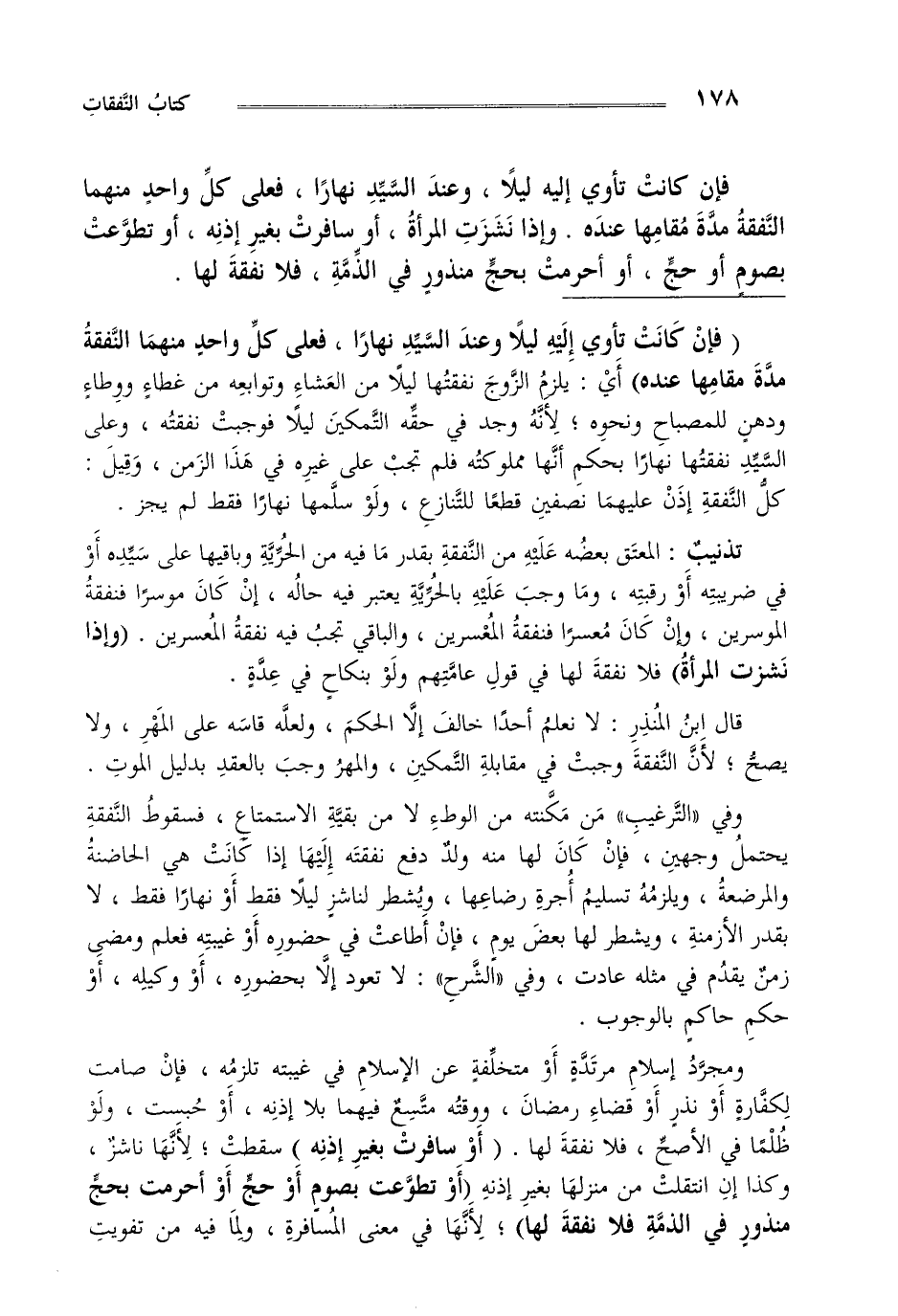 ومجرد إسلام مرتدة أو متخلفة عن الإسلام في غيبته تلزمه فإن صامت لكفارة أو نذر أو قضاء رمضان ووقته متسع فيهما بلا إذنه أو حبست ولو ظلما في الأصح فلا نفقة لها "أو سافرت بغير إذنه" سقطت لأنها ناشز وكذا إن انتقلت من منزلها بغير إذنه "أو تطوعت بصوم أو حج أو أحرمت بحج منذور في الذمة فلا نفقة لها" لأنها في معنى المسافرة ولما فيه من تفويت