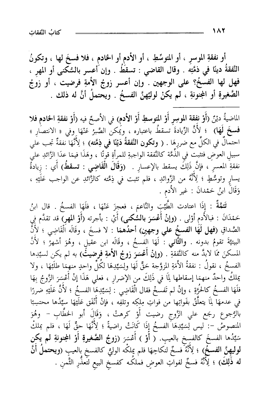 أو نفقة الموسر أو المتوسط أو الأدم أو الخادم فلا فسخ لها وتكون النفقة دينا في ذمته وقال القاضي تسقط وإن أعسر بالسكنى أو المهر فهل لها الفسخ على الوجهين وإن أعسر زوج الأمة فرضيت أو زوج الصغيرة أو المجنونة لم يكن لوليهن الفسخ ويحتمل أن له ذلك.