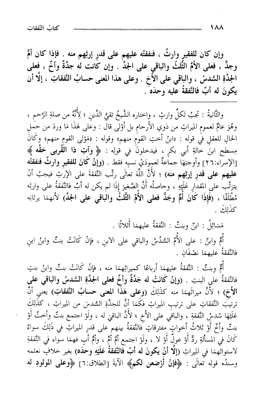 أم وبنت النفقة عليهما أرباعا كميراثهما منه فإن كانت بنت وابن بنت فالنفقة على البنت "وإن كانت له جدة وأخ فعلى الجدة السدس والباقي على الأخ" لأن ميراثهما منه كذلك "وعلى هذا المعنى حساب النفقات" يعني أن ترتيب النفقات على ترتيب الميراث فكما أن للجدة السدس من الميراث كذلك عليها سدس النفقة والباقي على الأخ لأن الباقي له ولو اجتمع بنت وأخت أو بنت وأخ أو ثلاث أخوات مفترقات فالنفقة بينهم على قدر الميراث في ذلك سواء كان في المسألة رد أو عول أو لا ولو اجتمع أم أم وأم أب فهما سواء في النفقة لإستوائهما في الميراث "إلا أن يكون له أب فالنفقة عليه وحده" بغير خلاف نعلمه وسنده قوله تعالى: { فَإِنْ أَرْضَعْنَ لَكُمْ} [الطلاق: 6] الآية { وَعَلَى الْمَوْلُودِ لَهُ