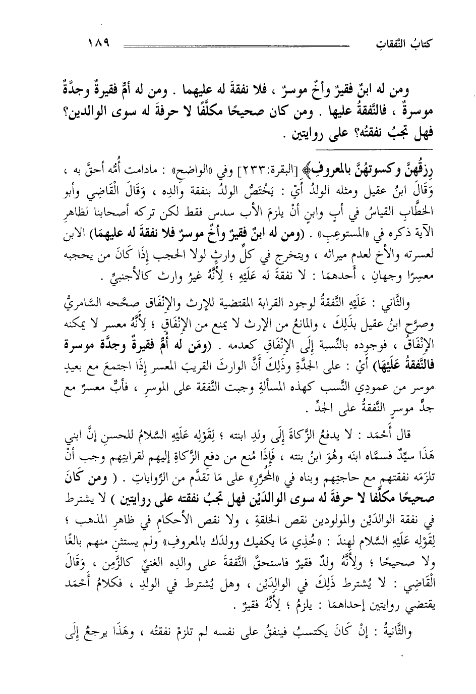 رِزْقُهُنَّ وَكِسْوَتُهُنَّ بِالْمَعْرُوفِ} [البقرة:233]وفي "الواضح" مادامت أمه أحق به وقال ابن عقيل ومثله الولد أي يختص الولد بنفقة والده وقال القاضي وأبو الخطاب القياس في أب وابن أن يلزم الأب سدس فقط لكن تركه أصحابنا لظاهر الآية ذكره في "المستوعب" "ومن له ابن فقير وأخ موسر فلا نفقة له عليهما" الابن لعسرته والأخ لعدم ميراثه ويتخرج في كل وارث لولا الحجب إذا كان من يحجبه معسرا وجهان أحدهما لا نفقة له عليه لأنه غير وارث كالأجنبي.