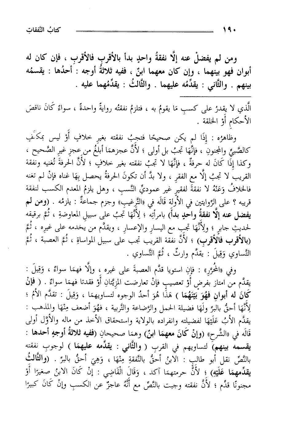 وظاهره إذا لم يكن صحيحا فتجب نفقته بغير خلاف أو ليس بمكلف كالصبي والمجنون فإنها تجب بل أولى لأن عجزهما أبلغ من عجز غير الصحيح وكذا إذا كان له حرفة فإنها لا تجب نفقته بغير خلاف لأن الحرفة تغنيه ونفقة القريب لا تجب إلا مع الفقر ولا بد أن تكون الحرفة يحصل بها غناه فإن لم تغنه فالخلاف وعنه لا نفقة لفقير غير عمودي النسب وهل يلزم المعدم الكسب لنفقة قريبه على الروايتين في الأولة قاله في "الترغيب" وجزم جماعة "يلزمه ومن لم يفضل عنه إلا نفقة واحد بدأ" بامرأته لأنها تجب على سبيل المعاوضه ثم برقيقه لحديث جابر ولأنها تجب مع اليسار والإعسار ويقدم من يخدمه على غيره ثم "بالأقرب فالأقرب" لأن نفقة القريب تجب على سبيل المواساه ثم العصبة ثم التساوي وقيل يقدم وارث ثم التساوي.