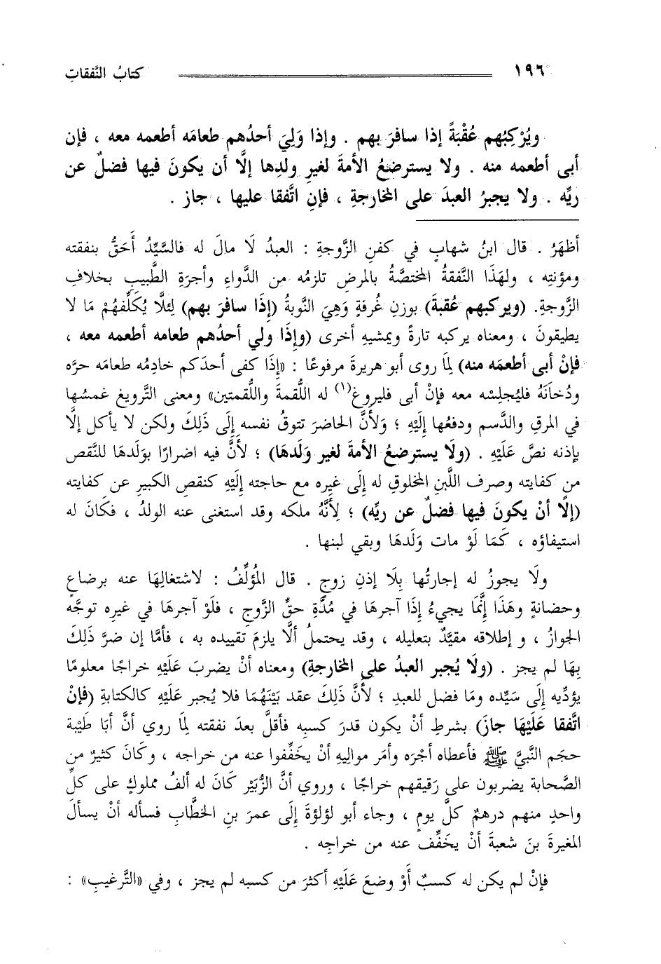 أظهر قال ابن شهاب في كفن الزوجة العبد لا مال له فالسيد أحق بنفقته ومؤنته ولهذا النفقة المختصة بالمرض تلزمه من الدواء وأجرة الطبيب بخلاف الزوجة "ويركبهم عقبة" بوزن غرفة وهي النوبة "إذا سافر بهم" لئلا يكلفهم ما لا يطيقون ومعناه يركبه تارة ويمشيه أخرى "وإذا ولي أحدهم طعامه أطعمه معه" فإن أبى أطعمه منه لما روى أبو هريرة مرفوعا "إذا كفى أحدكم خادمه طعامه حره ودخانه فليجلسه معه فإن أبى فليروغ له اللقمة واللقمتين" ومعنى الترويغ غمسها في المرق والدسم ودفعها إليه ولأن الحاضر تتوق نفسه إلى ذلك ولكن لا يأكل إلا بإذنه نص عليه "ولا يسترضع الأمة لغير ولدها" لأن فيه إضرارا بولدها للنقص من كفايته وصرف اللبن المخلوق له إلى غيره مع حاجته إليه كنقص الكبير عن كفايته "إلا أن يكون فيها فضل عن ريه" لأنه ملكه وقد استغنى عنه الولد فكان له استيفاؤه كما لو مات ولدها وبقي لبنها.