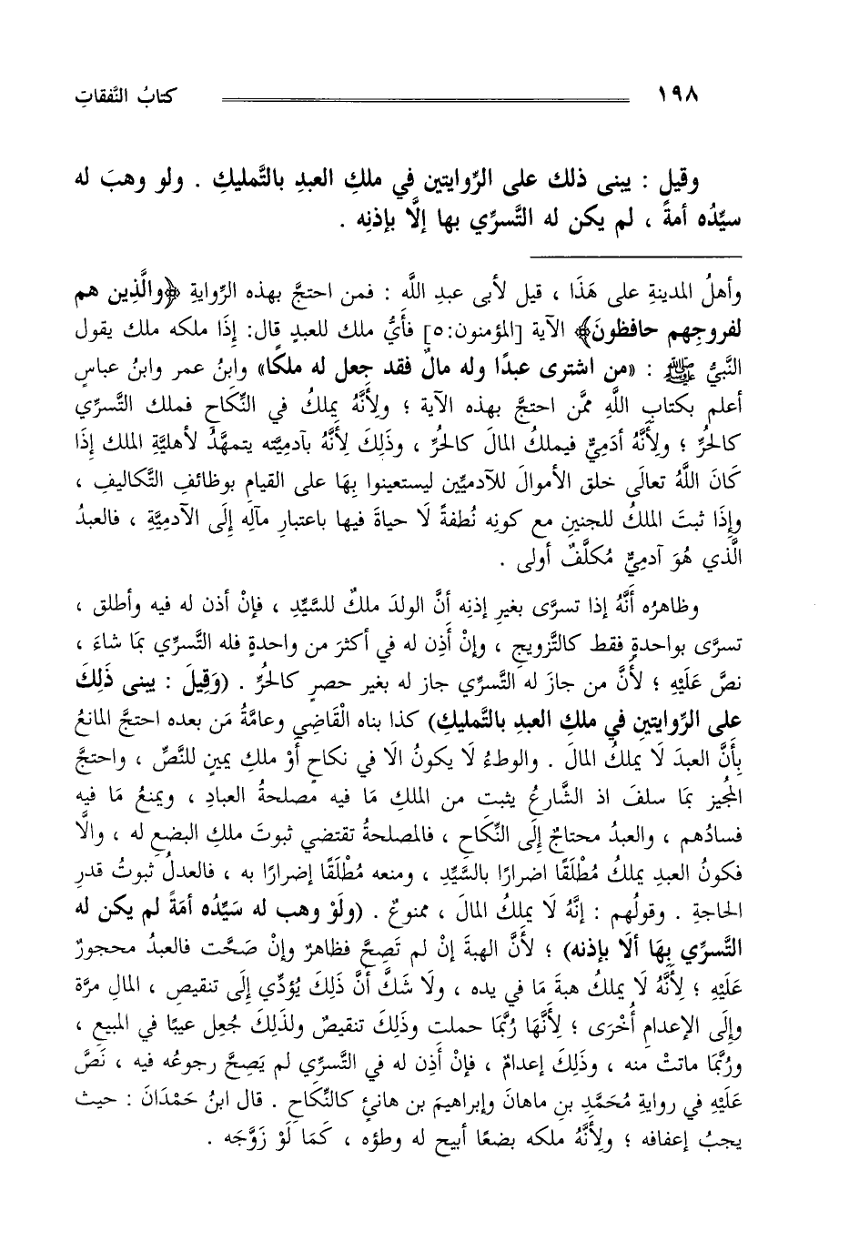 وأهل المدينة على هذا قيل لأبى عبد الله فمن احتج بهذه الرواية {وَالَّذِينَ هُمْ لِفُرُوجِهِمْ حَافِظُونَ} [المؤمنون:5] الآية فأي ملك للعبد قال إذا ملكه ملك يقول النبي صلى الله عليه وسلم: " من اشترى عبدا وله مال فقد جعل له ملكا" وابن عمر وابن عباس اعلم بكتاب الله ممن احتج بهذه الآية ولأنه يملك في النكاح فملك التسري كالحر ولأنه آدمي فيملك المال كالحر وذلك لأنه بآدميته يتمهد لأهلية الملك إذا كان الله تعالى خلق الأموال للآدميين ليستعينوا بها على القيام بوظائف التكاليف وإذا ثبت الملك للجنين مع كونه نطفة لا حياة فيها باعتبار مآله إلى الآدمية فالعبد الذي هو آدمي مكلف أولى.