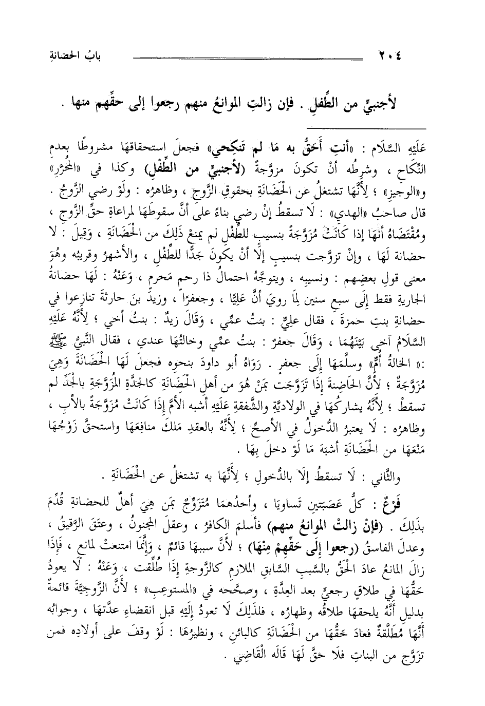 عليه السلام "أنت أحق به ما لم تنكحي" فجعل استحقاقها مشروطا بعدم النكاح وشرطه أن تكون مزوجة "لأجنبي من الطفل" وكذا في "المحرر" و"الوجيز" لأنها تشتغل عن الحضانة بحقوق الزوج وظاهره ولو رضي الزوج قال صاحب "الهدي" لا تسقط إن رضي بناء على أن سقوطها لمراعاة حق الزوج ومقتضاه أنها إذا كانت مزوجة بنسيب للطفل لم يمنع ذلك من الحضانة وقيل لا حضانة لها وإن تزوجت بنسيب إلا أن يكون جدا للطفل والأشهر وقريبه وهو معنى قول بعضهم ونسيبه ويتوجه احتمال ذا رحم محرم وعنه لها حضانة الجارية فقط إلى سبع سنين لما روي أن عليا وجعفرا وزيد بن حارثة تنازعوا في حضانة بنت حمزة فقال علي بنت عمي وقال زيد بنت أخي لأنه عليه السلام آخى بينهما وقال جعفر بنت عمي وخالتها عندي فقال النبي صلى الله عليه وسلم "الخالة" أم وسلمها إلى جعفر رواه أبو داود بنحوه فجعل لها الحضانة وهي مزوجة لأن الحاضنة إذا تزوجت بمن هو من أهل الحضانة كالجدة المزوجة بالجد لم تسقط لأنه يشاركها في الولادية والشفقة عليه أشبه الأم إذا كانت مزوجة بالأب وظاهره لا يعتبر الدخول في الأصح لأنه بالعقد ملك منافعها واستحق زوجها منعها من الحضانة أشبه ما لو دخل بها.