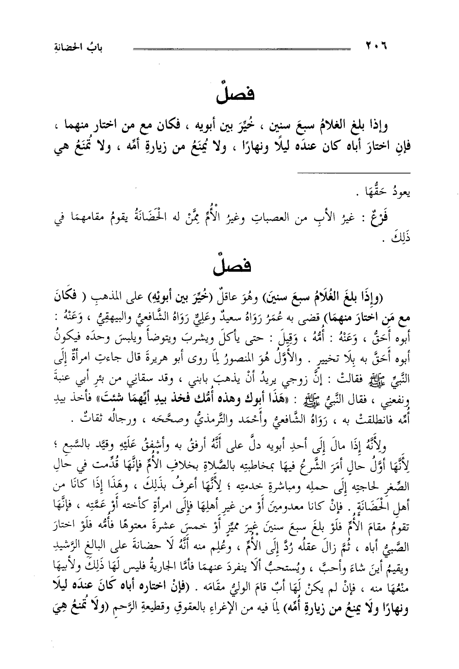 "وإذا بلغ الغلام سبع سنين" وهو عاقل "خير بين أبويه" على المذهب "فكان مع من اختار منهما" قضى به عمر رواه سعيد وعلي رواه الشافعي والبيهقي وعنه أبوه أحق وعنه أمه وقيل حتى يأكل ويشرب ويتوضأ ويلبس وحده فيكون أبوه أحق به بلا تخيير والأول هو المنصور لما روى أبو هريرة قال جاءت امرأة إلى النبي صلى الله عليه وسلم فقالت إن زوجي يريد أن يذهب بابني وقد سقاني من بئر أبي عنبة ونفعني فقال النبي صلى الله عليه وسلم: "هذا أبوك وهذه أمك فخذ بيد أيهما شئت" فأخذ بيد أمه فانطلقت به رواه الشافعي وأحمد والترمذي وصححه ورجاله ثقات.