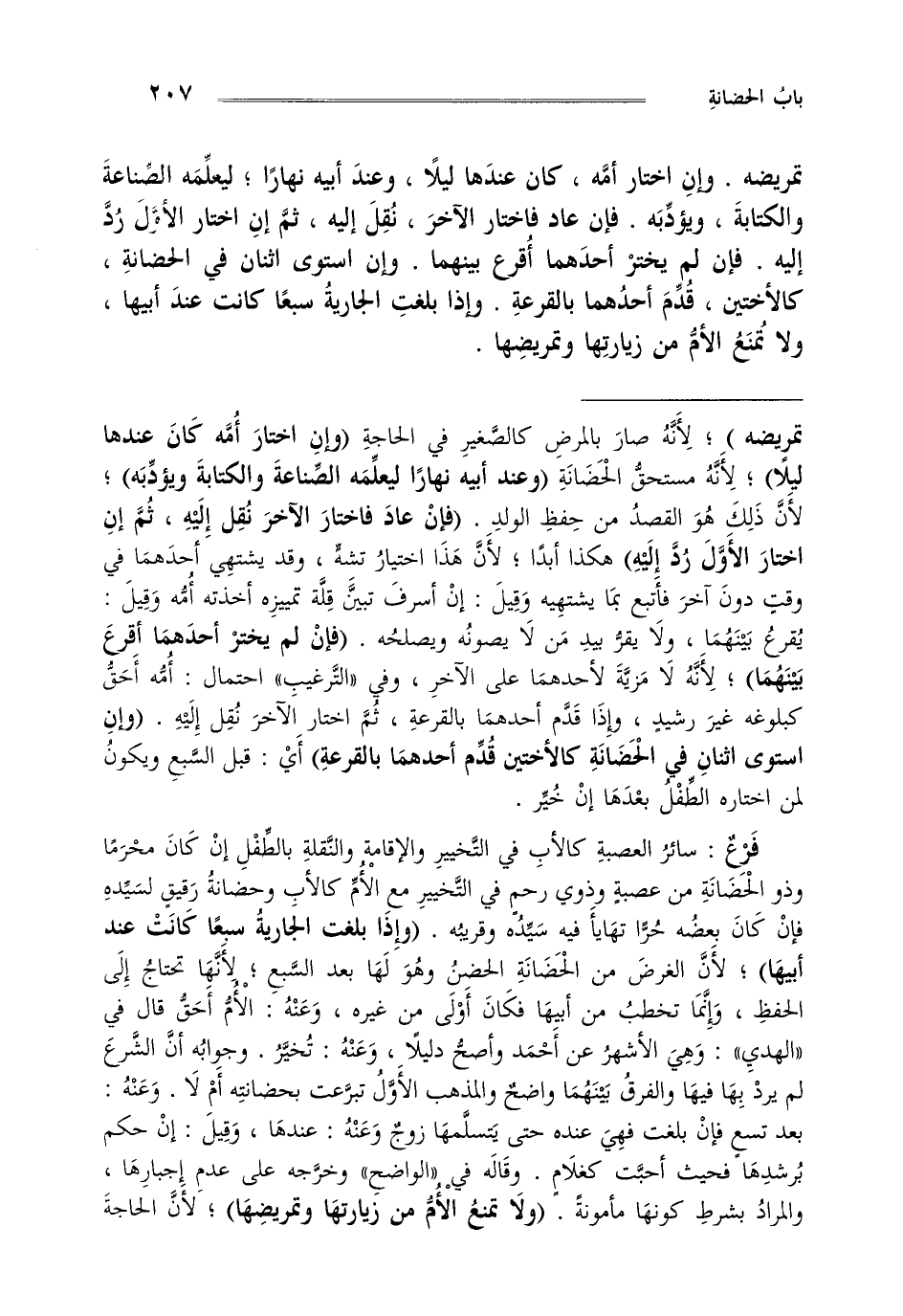 تمريضه وإن اختار أمه كان عندها ليلا وعند أبيه نهارا ليعلمه الصناعة والكتابة ويؤدبه فإن عاد فاختار الآخر نقل إليه ثم إن اختار الأول رد إليه فإن لم يختر أحدهما أقرع بينهما وإن استوى اثنان في الحضانة كالأختين قدم أحدهما بالقرعة وإذا بلغت الجارية سبعا كانت عند أبيها ولا تمنع الأم من زيارتها وتمريضها.