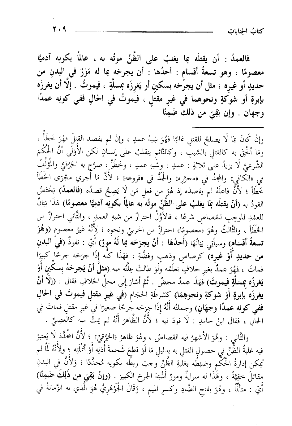 وإن كان بما لا يصلح للقتل غالبا فهو شبه عمد وإن لم يقصد القتل فهو خطأ وما ألحق به كالقتل بالسبب وكالنائم ينقلب على إنسان لكن الأولى أن الحكم الشرعي لا يزيد على ثلاثة عمد وشبه عمد وخطأ صرح به الخرقي والمؤلف في "الكافي" والمجد في "محرره" والجد في "فروعه" لأن ما أجري مجرى الخطإ خطأ لأن فاعله لم يقصده إذ هو من فعل من لا يصح قصده "فالعمد" يختص القود به "أن يقتله بما يغلب على الظن موته به عالما بكونه آدميا معصوما" هذا بيان للعمد الموجب للقصاص شرعا فالأول احتراز من شبه العمد والثاني احتراز من الخطإ والثالث وهو "معصوما" احتراز من الحربي ونحوه لأنه غير معصوم "وهو تسعة أقسام" وسيأتي بيانها "أحدها أن يجرحه بماله مور" أي نفوذ "في البدن من حديد أو غيره" كرصاص وذهب وفضة فهذا كله إذا جرحه جرحا كبيرا فمات فهو عمد بغير خلاف نعلمه ولو طالت علته منه "مثل أن يجرحه بسكين أو يغرزه بمسلة فيموت" فهذا عمد محض ثم أشار إلى محل الخلاف فقال "إلا أن يغرزه بإبرة أو شوكة ونحوهما" كشرطة الحجام "في غير مقتل فيموت في الحال ففي كونه عمدا وجهان" وجملته أنه إذا جرحه جرحا صغيرا في غير مقتل فمات في الحال فقال ابن حامد لا قود فيه لأن الظاهر أنه لم يمت منه كالعصي والثاني وهو الأشهر فيه القصاص وهو ظاهر "الخرقي" لأن المحدد لا يعتبر فيه غلبة الظن في حصول القتل به بدليل ما لو قطع شحمة أذنه أو أنملته ولأنه لما لم يمكن إدارة الحكم وضبطه بغلبة الظن وجب ربطه بكونه محددا ولأن في البدن مقاتل خفية وهذا له سراية ومور أشبه الجرح الكبير "وإن بقي من ذلك ضمنا" أي متألما وهو بفتح الضاد وكسر الميم وقال الجوهري هو الذي به الزمانة في