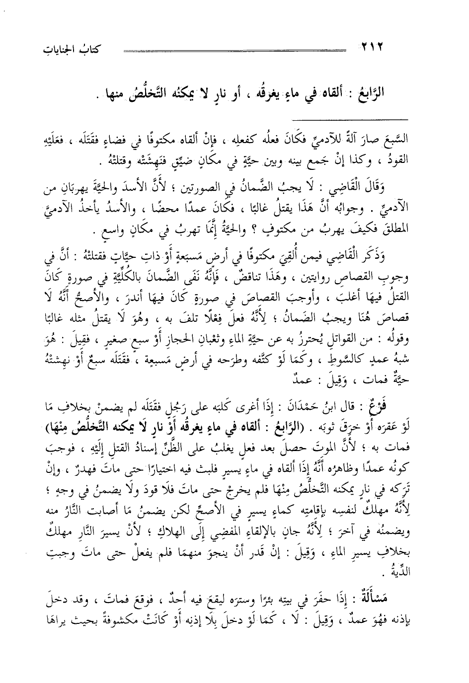 وذكر القاضي فيمن ألقي مكتوفا في أرض مسبعة أو ذات حيات فقتلته أن في وجوب القصاص روايتين وهذا تناقض فإنه نفى الضمان بالكلية في صورة كان القتل فيها أغلب وأوجب القصاص في صورة كان فيها أندر والأصح أنه لا قصاص هنا ويجب الضمان لأنه فعل فعلا تلف به وهو لا يقتل مثله غالبا وقوله من القواتل يحترز به عن حية الماء وثعبان الحجاز أو سبع صغير فقيل هو شبه عمد كالسوط وكما لو كتفه وطرحه في أرض مسبعة فقتله سبع أو نهشته حية فمات وقيل عمد.