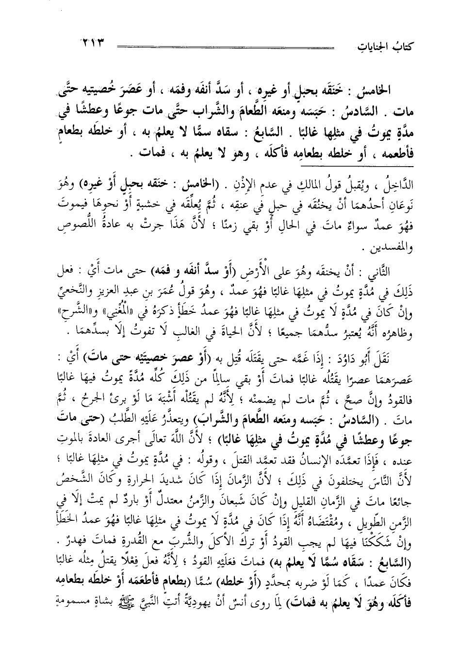 نقل أبو داود إذا غمه حتى يقتله قتل به "أو عصر خصيتيه حتى مات" أي عصرهما عصرا يقتله غالبا فمات أو بقي سالما من ذلك كله مدة يموت فيها غالبا فالقود وإن صح ثم مات لم يضمنه لأنه لم يقتله أشبه ما لو برئ الجرح ثم مات "السادس حبسه ومنعه الطعام والشراب" ويتعذر عليه الطلب "حتى مات جوعا وعطشا في مدة يموت في مثلها غالبا" لأن الله تعالى أجرى العادة بالموت عنده فإذا تعمده الإنسان فقد تعمد القتل وقوله في مدة يموت في مثلها غالبا لأن الناس يختلفون في ذلك لأن الزمان إذا كان شديد الحرارة وكان الشخص جائعا مات في الزمان القليل وإن كان شبعان والزمن معتدل أو بارد لم يمت إلا في الزمن الطويل و مقتضاه أنه إذا كان في مدة لا يموت في مثلها غالبا فهو عمد الخطإ وإن شككنا فيها لم يجب القود أو ترك الأكل والشرب مع القدرة فمات فهدر "السابع سقاه سمعا لا يعلم به" فمات فعليه القود لأنه فعل فعلا يقتل مثله غالبا فكان عمدا كما لو ضربه بمحدد "أو خلطه سما" "بطعام فأطعمه أو خلطه بطعامه فأكله وهو لا يعلم به فمات" لما روى أنس أن يهودية أتت النبي صلى الله عليه وسلم بشاة مسمومة