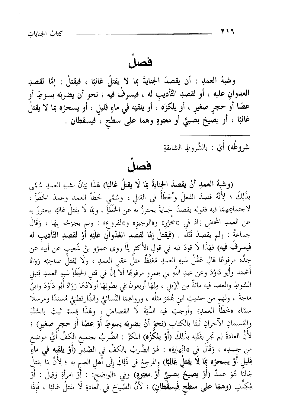 "وشبه العمد أن يقصد الجناية بما لا يقتل غالبا" هذا بيان لشبه العمد سمي بذلك لأنه قصد الفعل وأخطأ في القتل وسمي خطأ العمد وعمد الخطإ لاجتماعهما فيه فقوله يقصد الجناية يحترز به عن الخطإ وبما لا يقتل غالبا يحترز به عن العمد المحض زاد في "المحرر" و"الوجيز" و"الفروع" ولم يجرحه بها وقال جماعة ولم يقصد قتله "فيقتل إما لقصد العدوان عليه أو لقصد التأديب له فيسرف فيه" فهذا لا قود فيه في قول الأكثر لما روى عمرو بن شعيب عن أبيه عن جده مرفوعا قال عقل شبه العمد مغلظ مثل عقل العمد ولا يقتل صاحبه رواه أحمد وأبو داود وعن عبد الله بن عمرو مرفوعا إلا أن في قتل الخطإ شبه العمد قتيل السوط والعصا فيه مائة من الإبل منها أربعون في بطونها أولادها رواه أبو داود وابن ماجة ولهم من حديث ابن عمر مثله ورواهما النسائي والدارقطني مسندا ومرسلا سماه "خطأ العمد" وأوجب فيه الدية لا القصاص وهذا قسم ثبت بالسنة والقسمان الآخران ثبتا بالكتاب "نحو أن يضربه بسوط أو عصا أو حجر صغير" لأن العادة لم تجر بقتله بذلك "أو يلكزه" اللكز الضرب بجميع الكف أي موضع من جسده وقال في "النهاية" هو الضرب بالكف في الصدر "أو يلقيه في ماء قليل أو يسحره بما لا يقتل غالبا" والمرجع في ذلك إلى أهل العلم به لأن ما يقتل غالبا هو عمد "أو يصيح بصبي أو معتوه" وفي "الواضح" أو امرأة وقيل أو مكلف "وهما على سطح فيسقطان" لأن الصياح في العادة لا يقتل غالبا فإذا