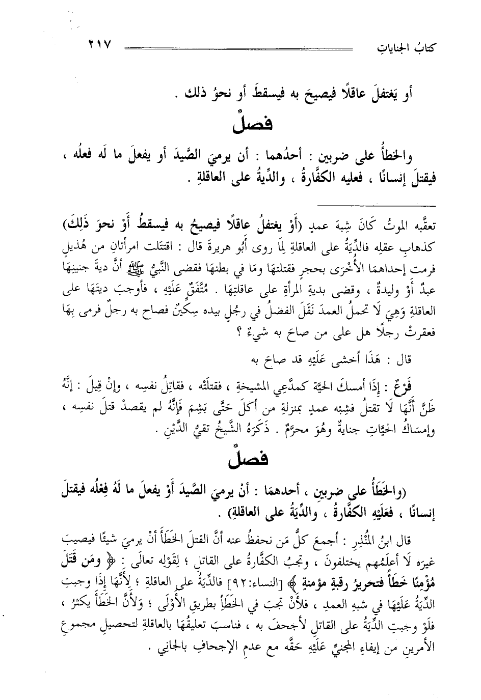"والخطأ على ضربين أحدهما أن يرمي الصيد أو يفعل ماله فعله فيقتل إنسانا فعليه الكفارة و الدية على العاقلة" قال ابن المنذر أجمع كل من نحفظ عنه أن القتل الخطأ أن يرمي شيئا فيصيب غيره لا أعلمهم يختلفون وتجب الكفارة على القاتل ل قوله تعالى: {وَمَنْ قَتَلَ مُؤْمِناً خَطَأً فَتَحْرِيرُ رَقَبَةٍ مُؤْمِنَةٍ} [النساء: 92] فالدية على العاقلة لأنها إذا وجبت الدية عليها في شبه العمد فلأن تجب في الخطأ بطريق الأولى ولأن الخطأ يكثر فلو وجبت الدية على القاتل لأجحف به فناسب تعليقها بالعاقلة لتحصيل مجموع الأمرين من إيفاء المجني عليه حقه مع عدم الإجحاف بالجاني