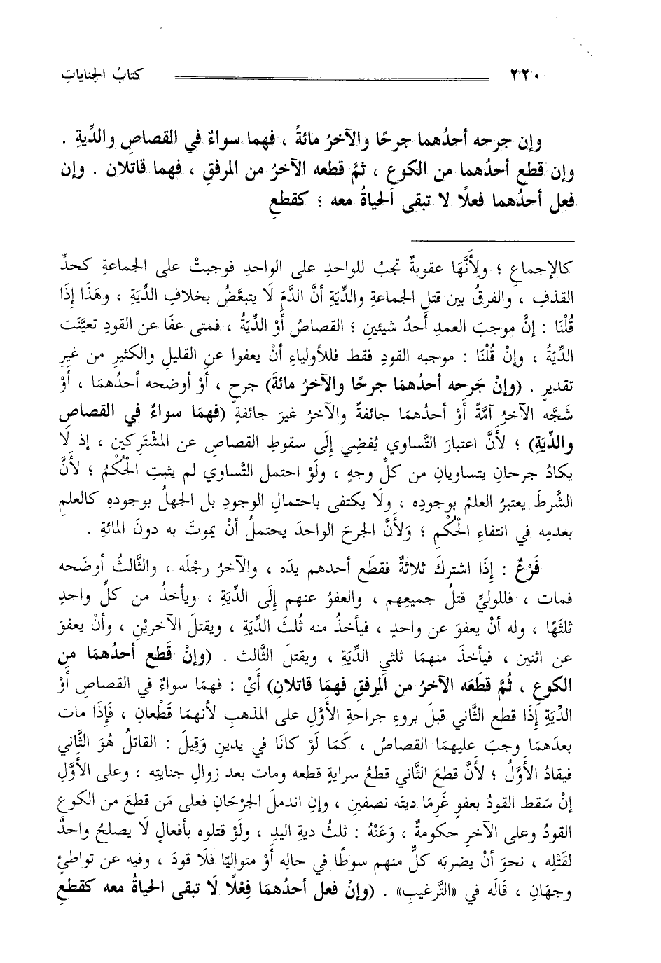 فرع : إذا اشترك ثلاثة فقطع أحدهم يده والآخر رجله والثالث أوضحه فمات فللولي قتل جميعهم والعفو عنهم إلى الدية ويأخذ من كل واحد ثلثها وله أن يعفو عن واحد فيأخذ منه ثلث الدية ويقتل الآخرين وأن يعفو عن اثنين فيأخذ منهما ثلثي الدية ويقتل الثالث "وإن قطع أحدهما من الكوع ثم قطعه الآخر من المرفق فهما قاتلان" أي فهما سواء في القصاص أو الدية إذا قطع الثاني قبل بروء جراحة الأول على المذهب لأنهما قطعان فإذا مات بعدهما وجب عليهما القصاص كما لو كانا في يدين وقيل القاتل هو الثاني فيقاد الأول لأن قطع الثاني قطع سراية قطعه ومات بعد زوال جنايته وعلى الأول إن سقط القود بعفو غرما ديته نصفين وإن اندمل الجرحان فعلى من قطع من الكوع القود وعلى الآخر حكومة وعنه ثلث دية اليد ولو قتلوه بأفعال لا يصلح واحد لقتله نحو أن يضربه كل منهم سوطا في حاله أو متواليا فلا قود وفيه عن تواطئ وجهان قاله في "الترغيب" "وإن فعل أحدهما فعلا لا تبقى الحياة معه كقطع