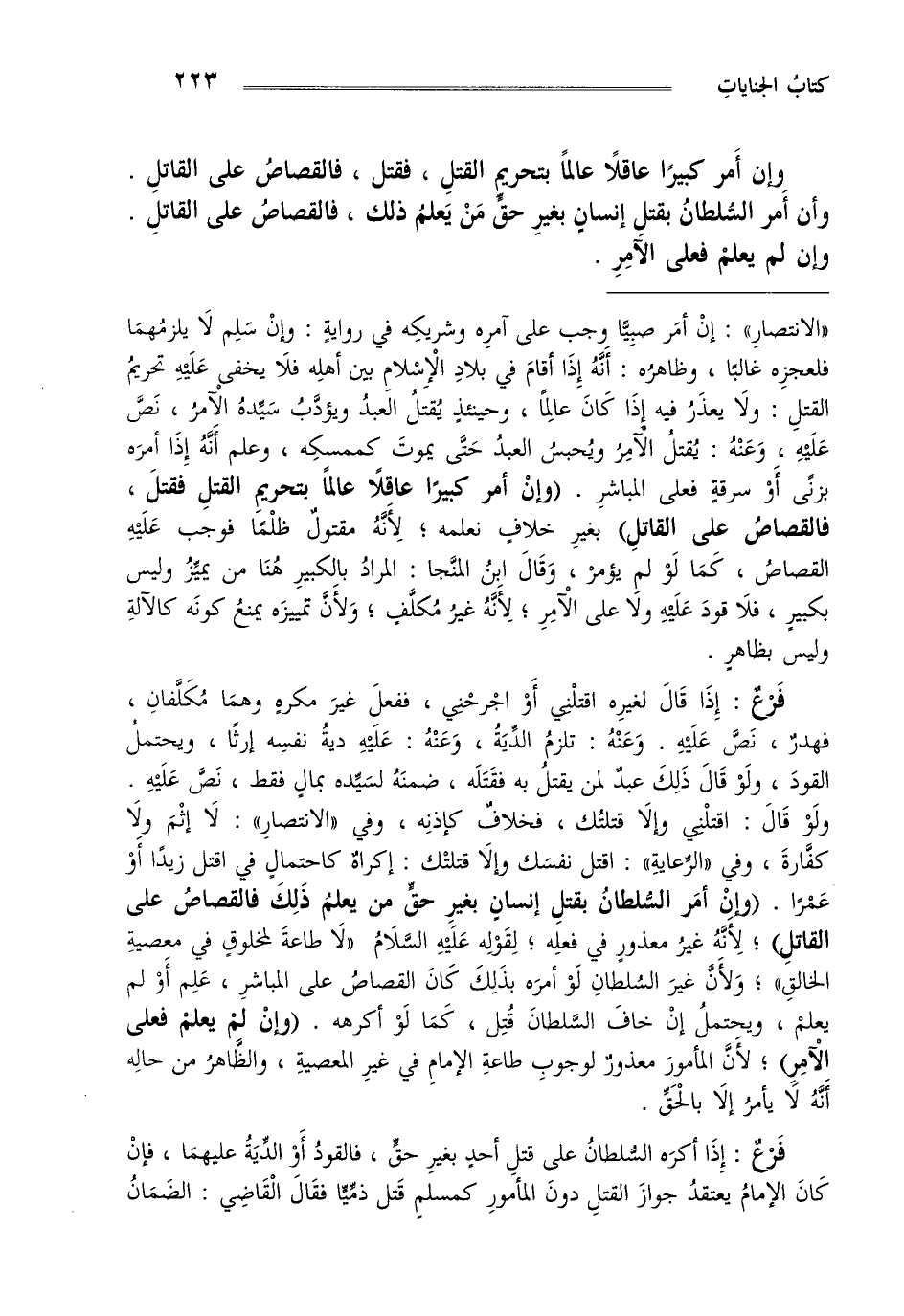 وإن أمر كبيرا عاقلا عالما بتحريم القتل فقتل فالقصاص على القاتل وإن أمر السلطان بقتل إنسان بغير حق من يعلم ذلك ، فالقصاص على القاتل وإن لم يعلم فعلى الآمر .