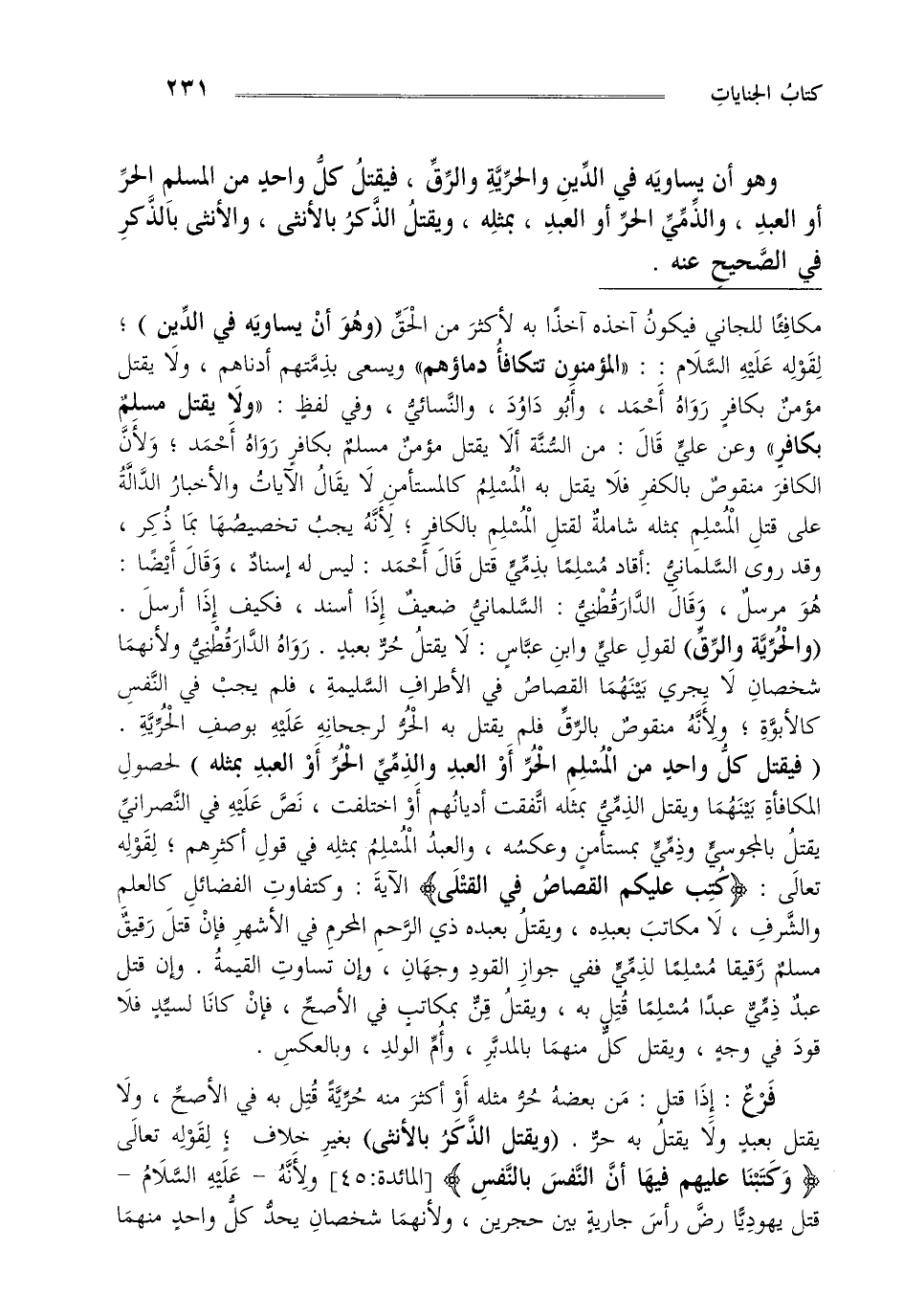 مكافئا للجاني فيكون آخذه آخذا به لأكثر من الحق "وهو أن يساويه في الدين" لقوله عليه السلام: "المؤمنون تتكافأ دماؤهم ويسعى بذمتهم أدناهم ولا يقتل مؤمن بكافر" رواه أحمد وأبو داود والنسائي وفي لفظ "ولا يقتل مسلم بكافر" وعن علي قال من السنة ألا يقتل مؤمن مسلم بكافر رواه أحمد ولأن الكافر منقوص بالكفر فلا يقتل به المسلم كالمستأمن لا يقال الآيات والأخبار الدالة على قتل المسلم بمثله شاملة لقتل المسلم بالكافر لأنه يجب تخصيصها بما ذكر وقد روى السلماني أقاد مسلما بذمي قتل قال أحمد ليس له إسناد وقال أيضا هو مرسل وقال الدارقطني السلماني ضعيف إذا أسند فكيف إذا أرسل "والحرية والرق" لقول علي وابن عباس لا يقتل حر بعبد رواه الدارقطني ولأنهما شخصان لا يجري بينهما القصاص في الأطراف السليمة فلم يجب في النفس كالأبوة ولأنه منقوص بالرق فلم يقتل به الحر لرجحانه عليه بوصف الحرية "فيقتل كل واحد من المسلم الحر أو العبد والذمي الحر أو العبد بمثله" لحصول المكافأة بينهما ويقتل الذمي بمثله اتفقت أديانهم أو اختلفت نص عليه في النصراني يقتل بالمجوسي وذمي بمستأمن وعكسه والعبد المسلم بمثله في قول أكثرهم ل قوله تعالى: {كُتِبَ عَلَيْكُمُ الْقِصَاصُ فِي الْقَتْلَى} [البقرة:178] الآية وكتفاوت الفضائل كالعلم والشرف لا مكاتب بعبده ويقتل بعبده ذي الرحم المحرم في الأشهر فإن قتل رقيق مسلم رقيقا مسلما لذمي ففي جواز القود وجهان وإن تساوت القيمة وإن قتل عبد ذمي عبدا مسلما قتل به ويقتل قن بمكاتب في الأصح فإن كانا لسيد فلا قود في وجه ويقتل كل منهما بالمدبر وأم الولد وبالعكس