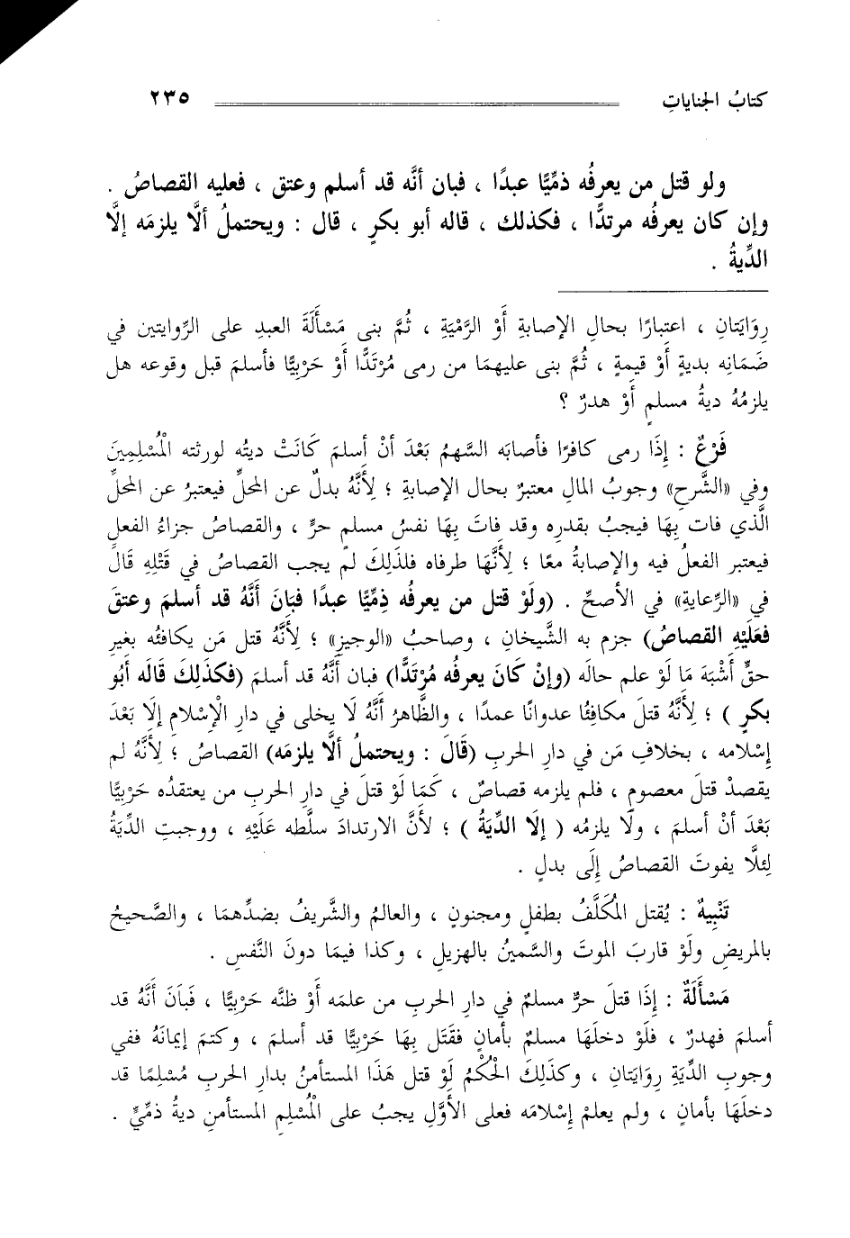 فرع إذا رمى كافرا فأصابه السهم بعد أن أسلم كانت ديته لورثته المسلمين وفي "الشرح" وجوب المال معتبر بحال الإصابة لأنه بدل عن المحل فيعتبر عن المحل الذي فات بها فيجب بقدره وقد فات بها نفس مسلم حر والقصاص جزاء الفعل فيعتبر الفعل فيه والإصابة معا لأنها طرفاه فلذلك لم يجب القصاص في قتله قال في "الرعاية" في الأصح "ولو قتل من يعرفه ذميا عبدا فبان أنه قد أسلم وعتق فعليه القصاص" جزم به الشيخان وصاحب "الوجيز" لأنه قتل من يكافئه بغير حق أشبه ما لو علم حاله "وإن كان يعرفه مرتدا" فبان أنه قد أسلم "فكذلك قاله أبو بكر" لأنه قتل مكافئا عدوانا عمدا والظاهر أنه لا يخلى في دار الإسلام إلا بعد إسلامه بخلاف من في دار الحرب "قال ويحتمل ألا يلزمه" القصاص لأنه لم يقصد قتل معصوم فلم يلزمه قصاص كما لو قتل في دار الحرب من يعتقده حربيا بعد أن أسلم ولا يلزمه "إلا الدية" لأن الارتداد سلطه عليه ووجبت الدية لئلا يفوت القصاص إلى بدل.