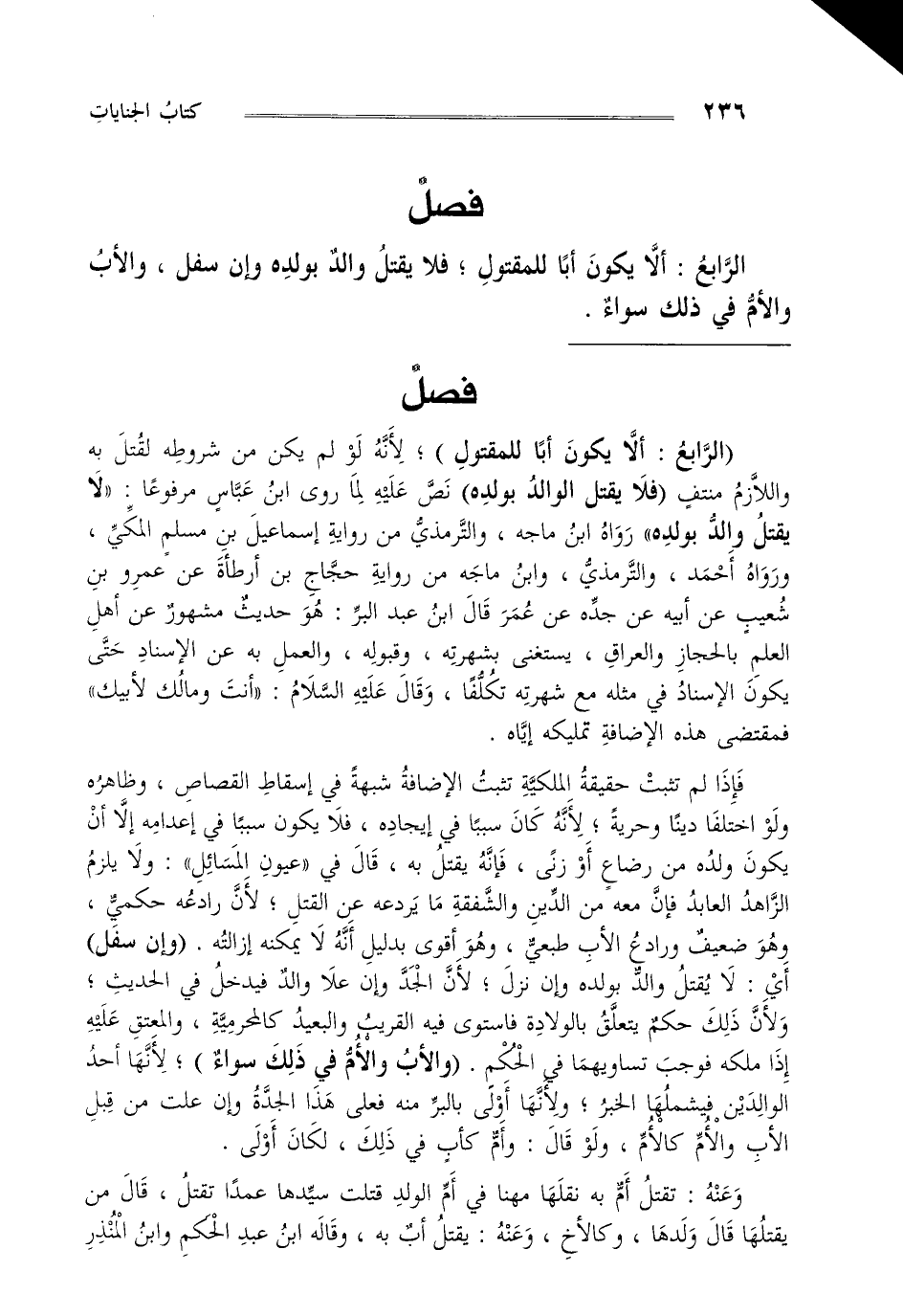فإذا لم تثبت حقيقة الملكية تثبت الإضافة شبهة في إسقاط القصاص وظاهره ولو اختلفا دينا وحرية لأنه كان سببا في إيجاده فلا يكون سببا في إعدامه إلا أن يكون ولده من رضاع أو زنى فإنه يقتل به قال في "عيون المسائل" ولا يلزم الزاهد العابد فإن معه من الدين والشفقة ما يردعه عن القتل لأن رادعه حكمي وهو ضعيف ورادع الأب طبعي وهو أقوى بدليل أنه لا يمكنه إزالته "وإن سفل" أي لا يقتل والد بولده وإن نزل لأن الجد وإن علا والد فيدخل في الحديث ولأن ذلك حكم يتعلق بالولادة فاستوى فيه القريب و البعيد كالمحرمية والمعتق عليه إذا ملكه فوجب تساويهما في الحكم "و الأب و الأم في ذلك سواء" لأنها أحد الوالدين فيشملها الخبر ولأنها أولى بالبر منه فعلى هذا الجدة وإن علت من قبل الأب والأم كالأم ولو قال وأم كأب في ذلك لكان أولى.